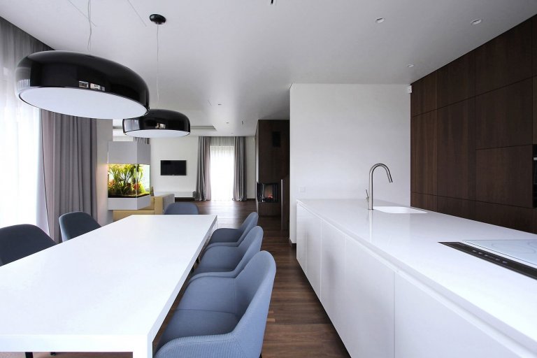 Současný minimalistický styl fandí v interiéru hlavně bílé, šedé a černé barvě. V tomto duchu je zařízen i interiér dvoupodlažního domu ve čtvrtém největším litevském městě Šiauliai, jehož tvůrci jsou architekti Ramūnas Manikas a Valdas Kontrimas. Černo-šedo-bílé bydlení zde barevně rozbíjí jen moderně pojaté akvárium, které na sebe okamžitě strhává pozornost.