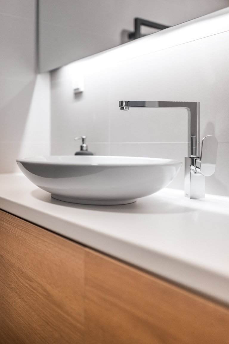 Neutrální barvy bydlení rodině umožňují jakékoliv změny do budoucna, nebo použití libovolných doplňků. Bílé stěny prostor opticky zvětšují a vytvořené osvětlené podhledy místnosti příjemně dokreslují. Na fotografiích je vidět, jak důležité je použití vícero osvětlení v interiéru. Pro srovnání jsou fotografie vyfoceny za denního světla a také při rozsvícených světlech.