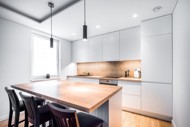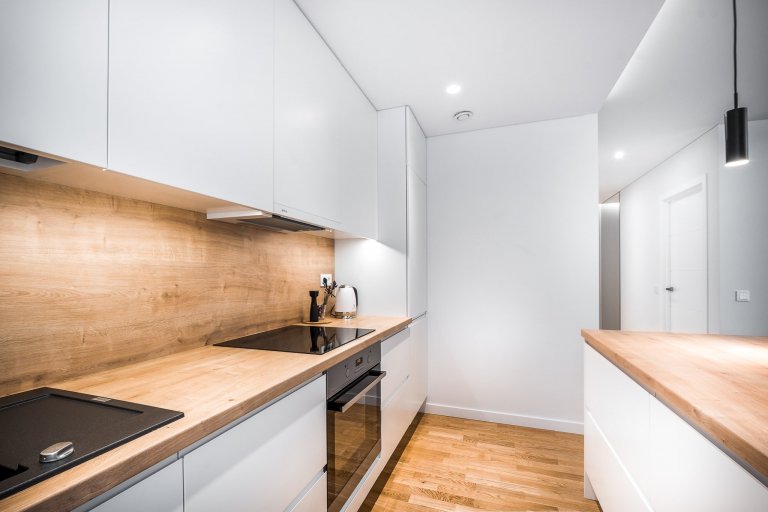 Kuchyňská linka je zhotovena celá v bílém a spotřebiče jsou vestavné. Nenápadná je také digestoř. Na první pohled si ji člověk ani nevšimne. Bílé plochy v kuchyni oživují pracovní desky z masivního dřeva a obložení kuchyňské linky. Za povšimnutí, a pochvalu designérům, stojí také využití velkých zásuvek v kuchyni, místo klasických spodních skříněk. Zásuvky se otevírají zatažením za hranu, takže není potřeba standardních viditelných úchytek, které často narušují vizuální dojem.