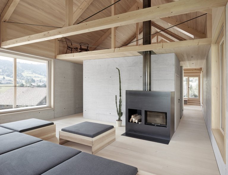 V horním patře je obývací část tvořená několika pokoji, v jejich středu se nachází schodiště, ve kterém je umístěna toaleta a komora. Kolem těchto přístaveb z exponovaného betonu je obývací a jídelní část, světlá a otevřená až po hřeben. Je to velmi světlý prostor s krbem v centru místnosti. Relativně malý prostor je navržen tak, aby měl co nejméně věcí a co nejvíce světla. V obývacím pokoji je místo sedačky pódium s polštáři. Je to proto, že by vysoká záda pohovek a křesel narušovala sluneční paprsky pronikající velkými okny. Kolem celého domu vede krytá terasa, která umožňuje snadný přechod z vnitřku ven. Fasádu tvoří masa svislých a vodorovných smrkových lamel, obklopujících uvnitř místnosti vysoké skleněné nebo stříkané omítané povrchy. To dává budově stejnorodý vzhled. Takto bylo vytvořeno široké spektrum průsvitnosti a průhlednosti, které je postupně a individuálně přizpůsobeno každé místnosti, jejímu účelu a úrovni požadované intimity.