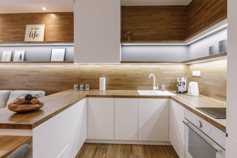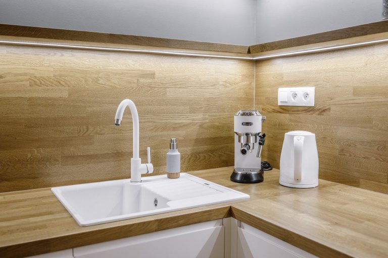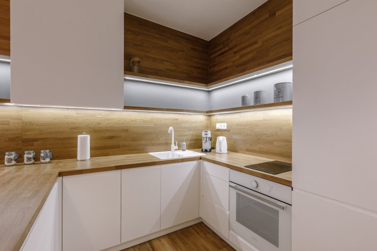 K vytváření příjemné atmosféry v bytě slouží stmívatelná světla, která umožňují regulovat intenzitu jejich záření. Za zmínění jistě stojí i fakt, že majitel v obývacím pokoji zrušil jedno centrální světlo a rozmístil po pokoji bodová svítidla, která pokoj osvětlují rovnoměrně, což je velmi příjemné. Když se podíváme do kuchyně, můžeme si všimnout toho, že je většina úložných prostor umístěna ve spodních skříňkách. Nad linkou najdeme pouze jednu skříň určenou pro skladování sklenic a šálků. Zbytek prostoru zaplňují police. Jako obklad zde byl použit také dub, který se velmi dobře čistí. A na rozdíl od skla či obkladu na něm nejdou vidět tolik nečistoty. V bytě nenajdeme obrazy pověšené na stěně, ale ty, které jsou postaveny na policích.