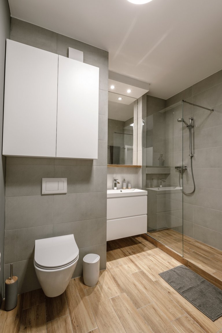 Celý interiér je díky výrobě nábytku na zakázku hezky sladěný. Nejen co se materiálu týče, ale také barev. Ačkoliv jde o finančně náročnější variantu oproti sériově vyráběnému nábytku, má majitel jistotu, že je každý kus vyroben na míru jeho bydlení. Ze všeho můžeme vypíchnout například atypickou polici vedle televizoru, která skryje nevzhledné kabely od televize před zraky okolí, ale také skříň v koupelně, kde je ukryta pračka a kotel.