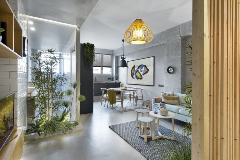 Byt s kouzelným nádechem přímořské atmosféry se rozkládá na ploše 46 m² a na první pohled zaujme především zajímavě řešenými vnitřními zdmi. Byt ve tvaru úzkého obdélníku totiž sestává ze samostatně koncipované ložnice, která je od ostatního prostoru oddělená pomocí přepážek z dřevěných latí. V interiéru lze však najít také netradiční stěnu ze skla či z živých rostlin. Takto volené stěny tak jistým způsobem dodávají obyvateli bytu pocit soukromí, ale zároveň interiéru neubírají na vzdušnosti a prosvětlení. Živé rostliny vůbec tvoří hlavní komponent bytu, a tím mu dodávají na přirozené kráse a svěžesti.