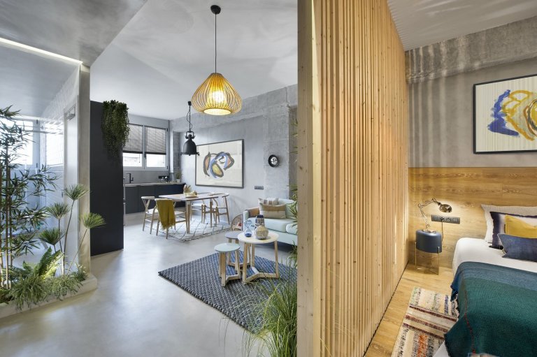 Srdcem tohoto roztomilého a zbrusu nového domova je otevřená místnost propojující obývací zónu s tou kuchyňskou a jídelní. Díky absenci bariér mezi jednotlivými částmi interiéru tak došlo k jeho zvětšení a provzdušnění. Výjimkou je pouze prostor určený ke spánku, který si nadále uchovává své soukromí. V kdysi šedé tovární hale tak vzniklo místo, které je klidnou oázou plnou barev. A které si i přesto uchovává několik vzpomínek na velký průmyslový boom ve Španělsku.