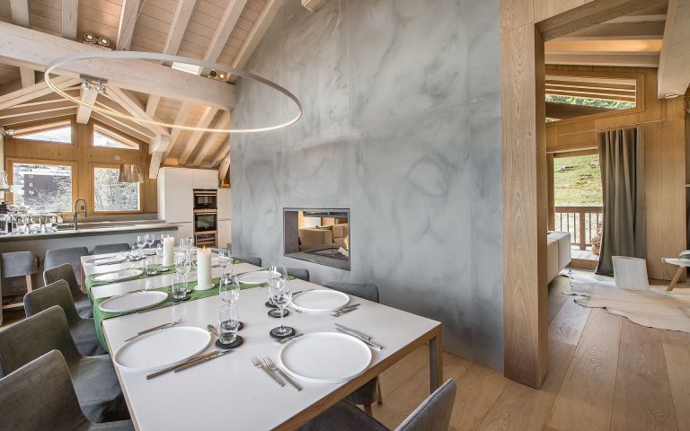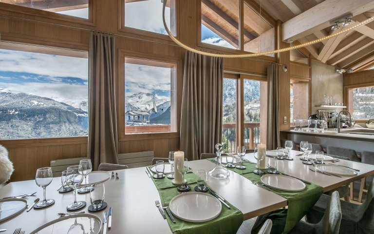 Překrásný výhled do okolí je z oken u jídelního stolu. Strávníci si tak mohou vychutnat jídlo v teple domova a užívat si zároveň pohledu na přírodu. Díky velkému množství oken, které jsou vetknuty i v průčelí domu těsně pod střechou, je v interiéru dostatek denního světla.