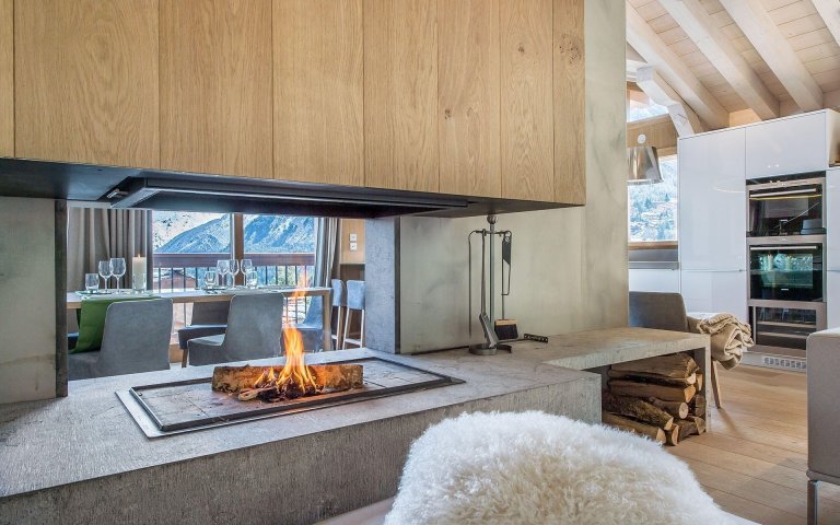 Jednotlivé funkční zóny rozděluje mezistěna s krbem uprostřed místnosti. V kontrastu se surovou betonovou stěrkou je dřevo použité na obkladu krbu a jednoduchý nábytek stojící na subtilních nohách. Celý prostor osvětlují velká kruhová stropní světla v kuchyni i obývacím pokoji.