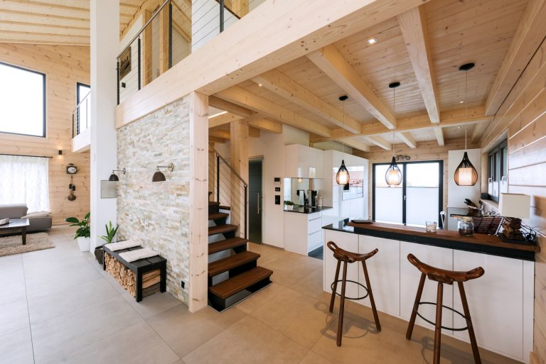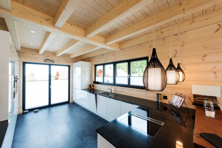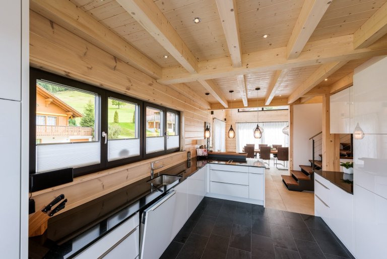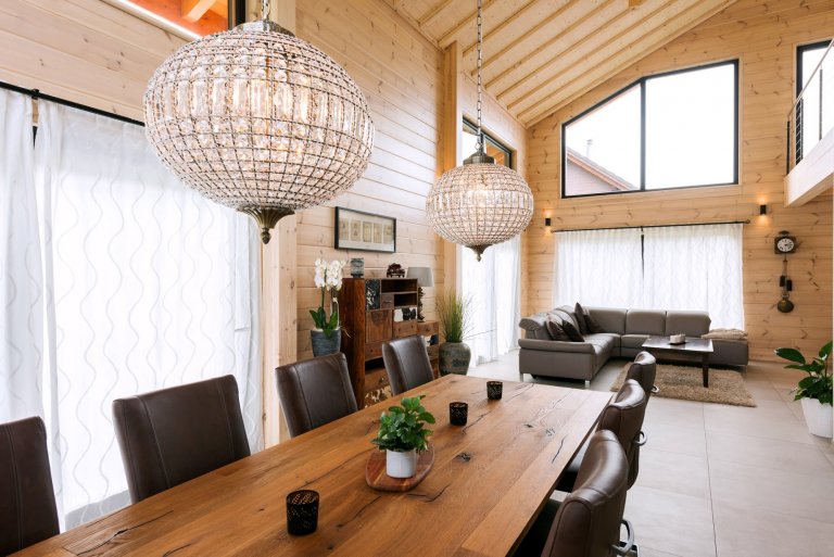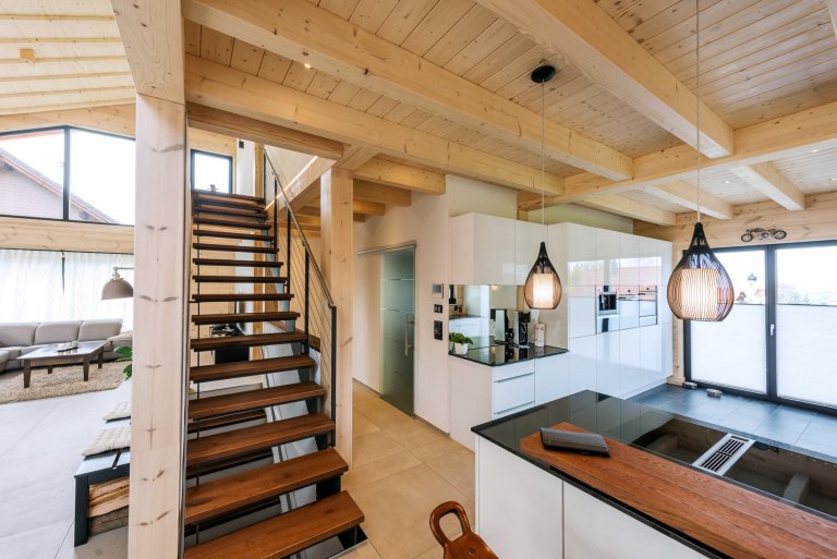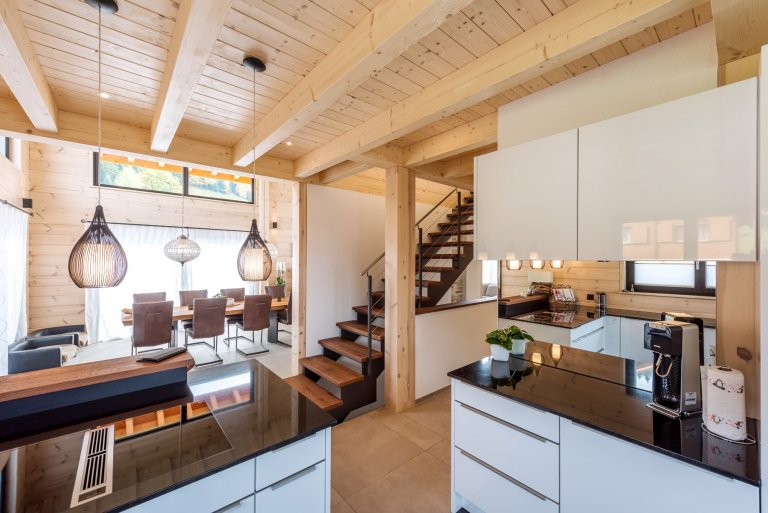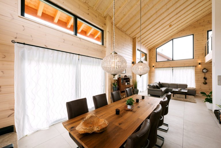 Velmi vysoký vzdušný prostor, otevřený až na hřeben, se táhne přes obývací a jídelní zónu v přízemí a zdůrazňuje prostornost domu. Výsledkem je obzvláště prostorné a vzdušné bydlení bez bariér. Naprosto impozantně vypadá otevřená hřebenová vaznice, která zde představuje dekorativní prvek. Vaznice zároveň zdůrazňuje tradiční charakter dřevěného domu. Chemicky neošetřené dřevo spolu s moderní architekturou interiéru dává vzniknout vysoce komfortnímu bydlení se zdravým vnitřním klimatem.