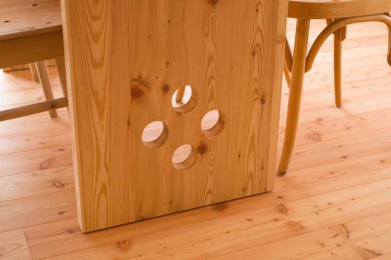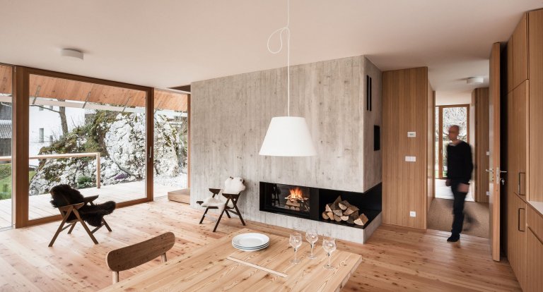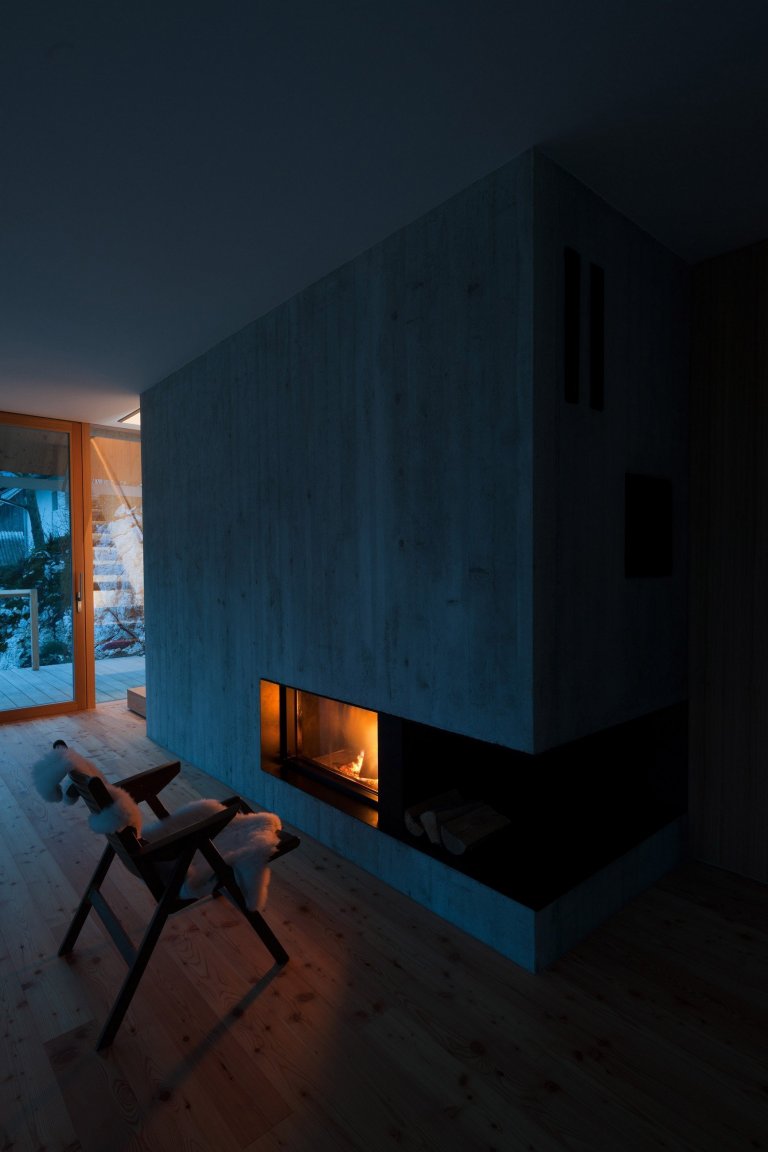 To, jaké materiály se využijí v interiéru, určovalo zejména horské prostředí, v němž dům stojí. Najdeme zde hlavně dřevo ve formě dřevotřísky nebo klasické řezivo z modřínu, jenž má olejovou a voskovou povrchovou úpravu. Jako kontrast zde slouží kámen. Ačkoliv je plocha domu menší, nabízí vše, co je k životu potřeba. Prostory v domě byly využity na maximum, díky čemuž dům může nabídnout zázemí až pro čtyři osoby. Dům je i velmi flexibilní, takže se počítá s možnými úpravami v budoucnu.