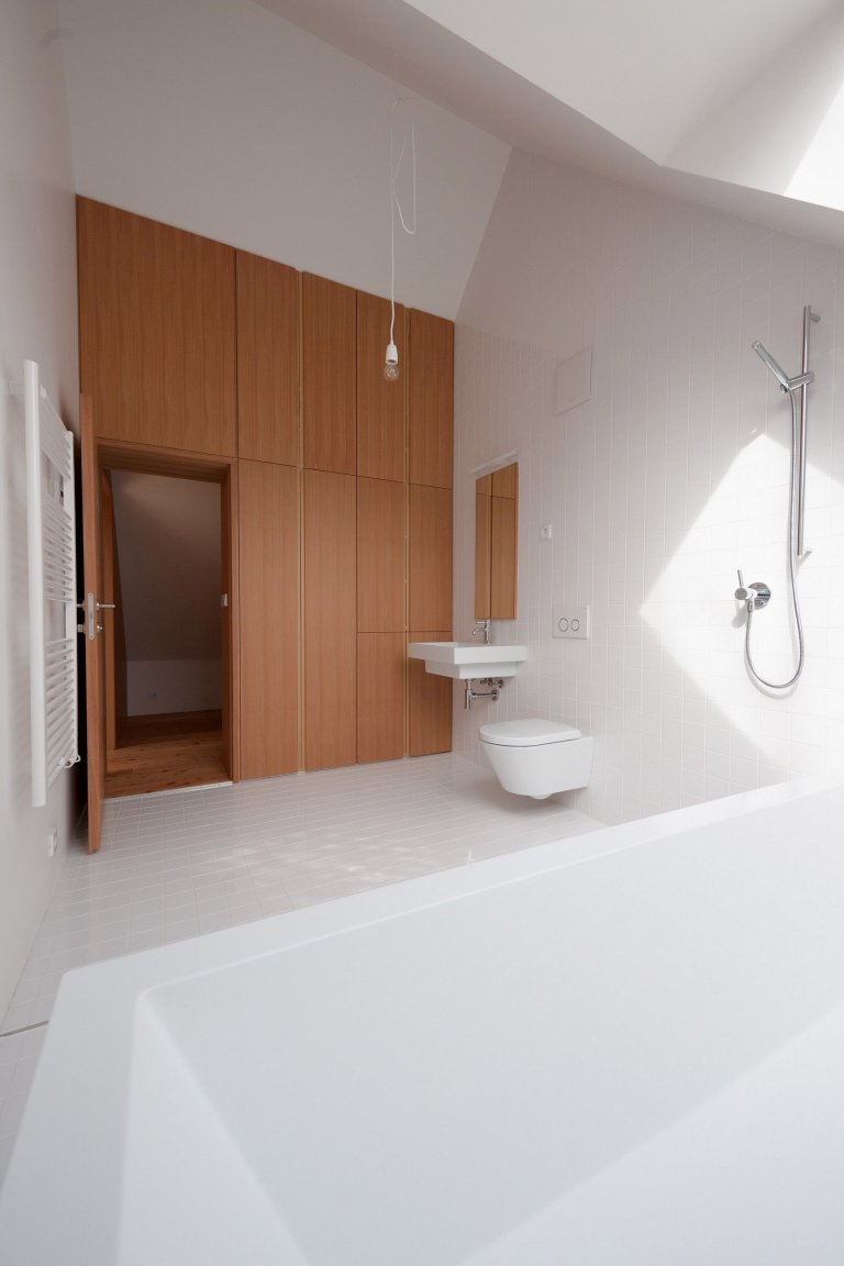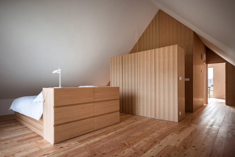 Obývací pokoj je schodištěm spojen přímo s ložnicí, jež je oddělena pomocí vestavěných skříní. V přízemí se nachází i samostatný byt určený k pronájmu či využití jako další ložnice.