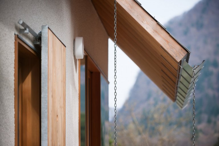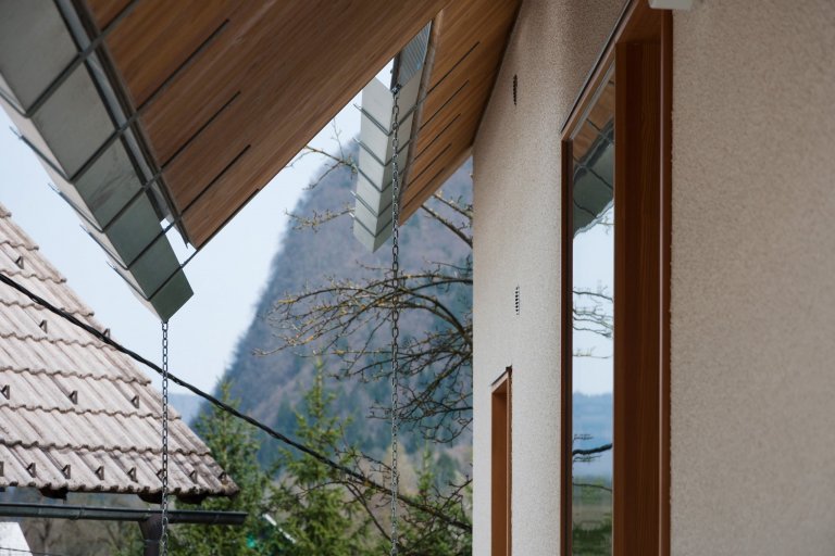 Subtilnost střešní konstrukce podtrhuje použití tenké vláknocementové šablony v šedé barvě. Každého zaujmou i okapy z pozinkovaného plechu ve tvaru písmene V, jež jsou připomínkou dřevěných okapů z fošen.