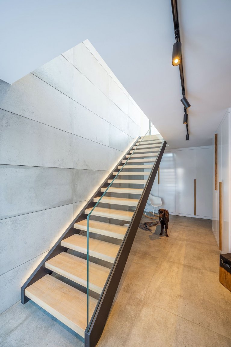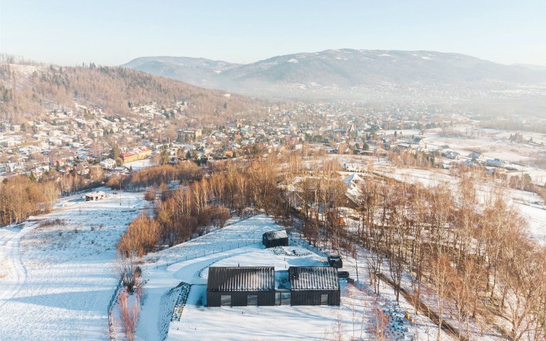 Dvoupodlažní budova rozkládající se na ploše o velikosti 300 m2 se nachází nedaleko města Bielsko-Biała v jižním Polsku. Duo architektů ve složení Gosia Łapaj a Kuba Kowalczyk využilo krásných výhledů na hornatou krajinu i přilehlé údolí a dům zčásti zapustili do svahu. Dům ležící na dlouhém svažitém pozemku navíc do okolí otevřeli velkoformátovými okny, která do interiéru přinášejí dostatek denního světla. Hranice mezi exteriérem a interiérem se tak zčásti setřela. Zajímavým architektonickým osvěžením je i skleněný krček v horní hmotě domu, který odděluje hlavní obytnou zónu od ložnice.