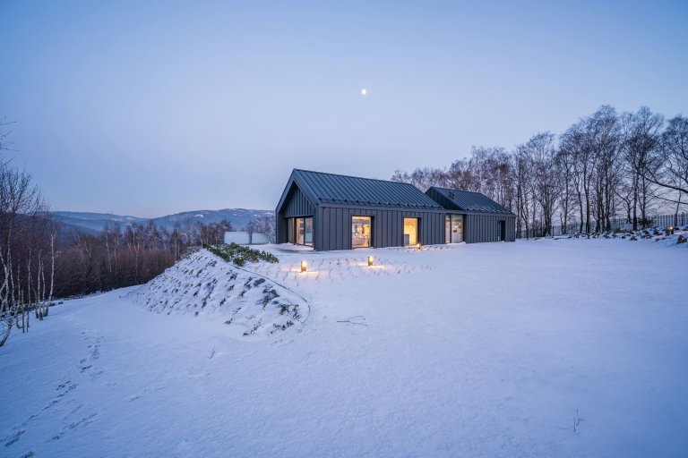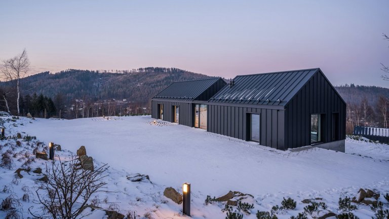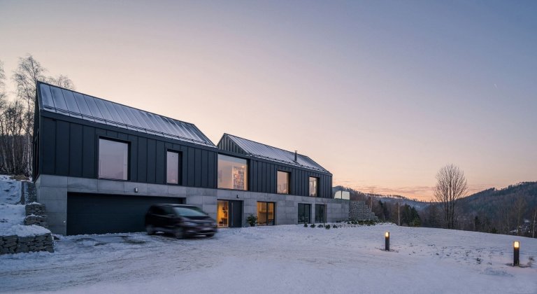 V malebné krajině Slezských Beskyd byl do svahu posazen moderní dům, který se stal originálním venkovským sídlem pro pětičlennou rodinu. Z části je zapuštěn do země, a tak od příjezdové cesty ukazuje jen svou horní polovinu s tradiční sedlovou střechou. Z pohodlí domova prohřátého teplem krbu poskytuje úchvatné výhledy do zasněženého okolí.