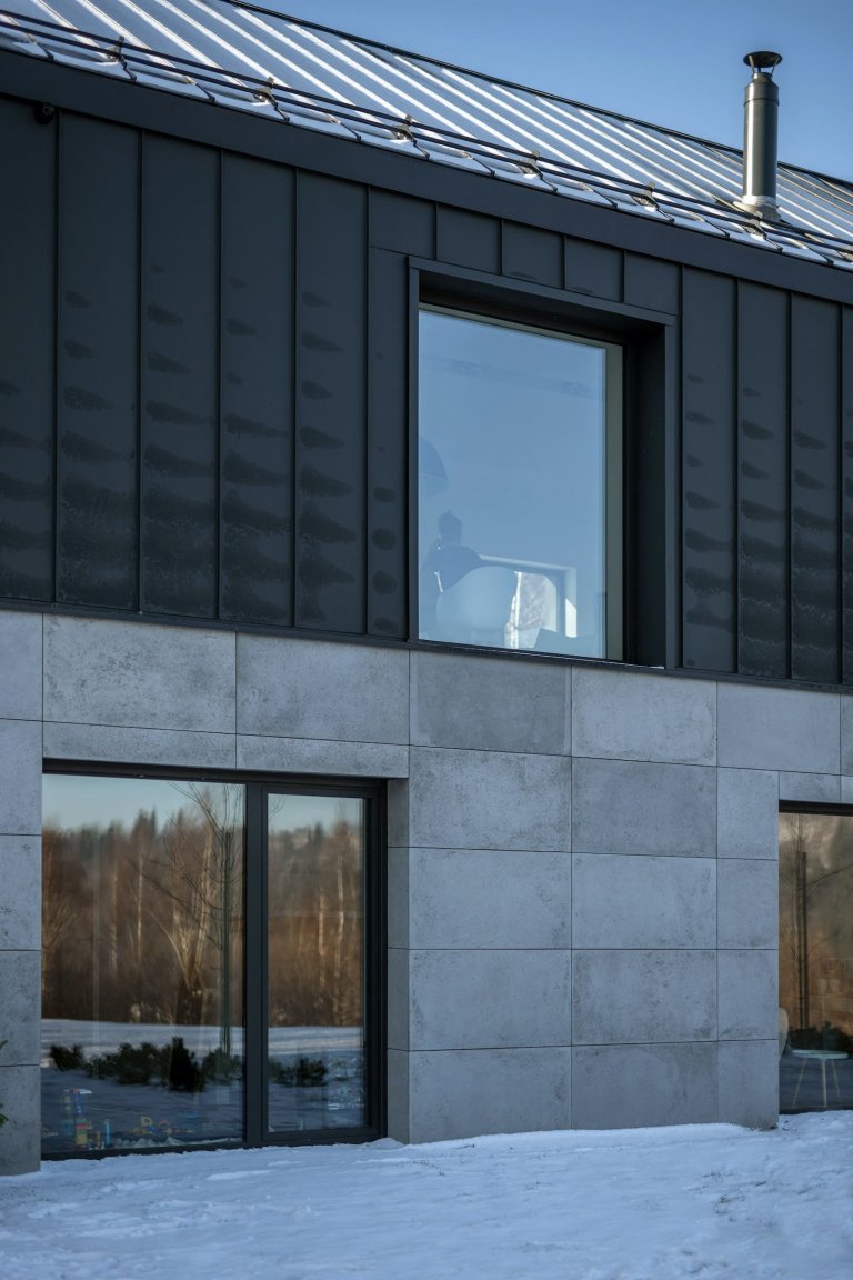 Dům v horách na první pohled zaujme tradiční sedlovou střechou s krytinou z falcovaných plechů. Tento materiál se opakuje také na fasádě. Do svahu částečně zapuštěné spodní patro bylo zase obloženo betonovými deskami. Toto podlaží se ze tří stran nachází pod stávající úrovní terénu, zatímco čtvrtá strana je otevřená do zahrady. Spodní podlaží uvedené vstupní částí domu v sobě zaujímá tři dětské pokoje, technickou místnost a garáž. Centrální zónou horního podlaží je obývací pokoj propojený s kuchyní a jídelnou. Nachází se zde i ložnice, koupelna a šatna.
