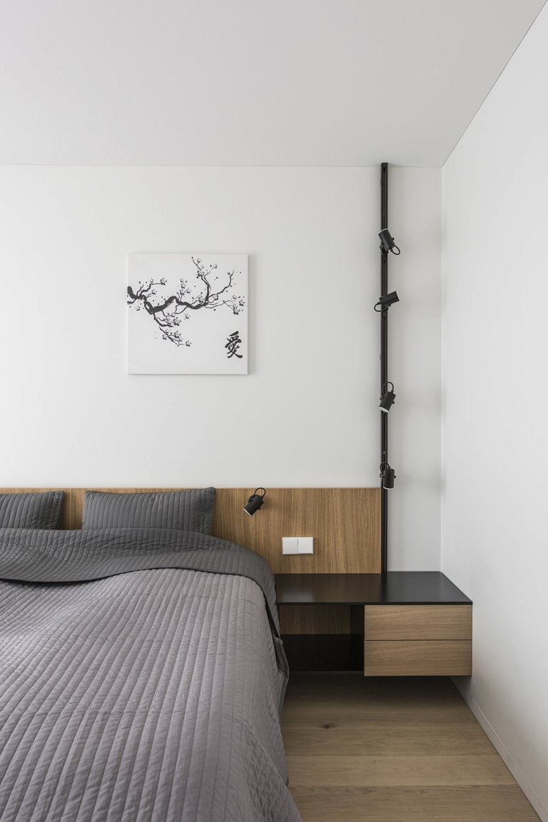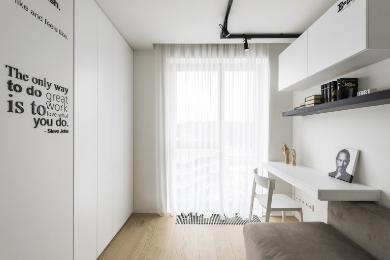 Součástí bytu je ložnice ve které se nachází vestavěná skříň, částečně umístěná za postelí. Otevírání dveří tak může kolidovat s prostorem nad postelí. Velmi nevšední je také řešení pracovního stolu ve studentském pokoji, kdy pracovní deska stolu zasahuje až nad postel. Tato varianta je z hlediska bezpečnosti poněkud odvážná a je na zvážení majitelů zda při ní zůstanou. Celkové pojetí interiéru je velmi nápadité, nemělo by se ale zapomínat také na funkčnost a praktické užívání. A co si o tom myslíte vy?