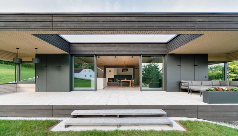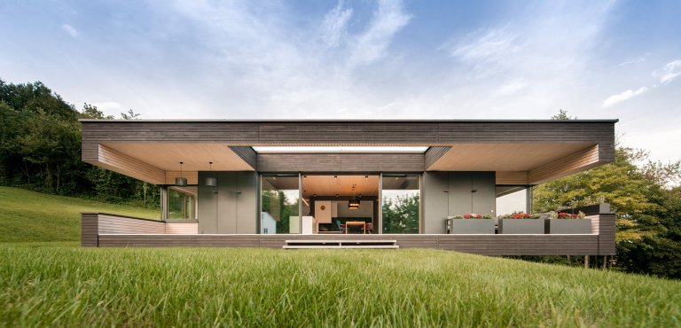 Zatímco bungalov pevně stojí nad garáží, vypadá to, jako by jednou svou částí levitoval nad svahem. Architekti si totiž s jeho zasazením do svažitého terénu znamenitě poradili. Budova tak navzdory svému subtilnímu plášti působí příjemně křehkým a vzdušným dojmem, o což se starají i velké prosklené plochy propojující interiér s exteriérem.
