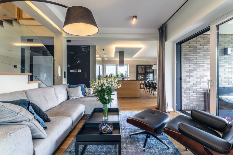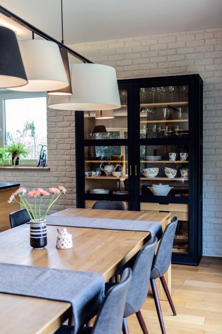 Díky citu pro barvy a jejich kombinace, ale také s ohledem na propojení různých stylů, zde vzniklo opravdu originální bydlení. Jeho osobitost navíc vyniká právě díky hojně využitým designovým prvkům, jejichž začlenění do interiéru si vyžádalo hodně odvahy. K těm již zmíněným tak lze ještě přičíst originální svítidla, osobité obrazy, ale také působivý přechod mezi dřevěnou a kamennou podlahou v kuchyni či masivní světlý dřevěný stůl v kombinaci s tmavými moderními židlemi. A ač se to může zdát zvláštní, jednou z dominant interiéru tohoto domu je i zajímavě provedené schodiště, které v sobě snoubí praktickou i estetickou funkci. Jeho krásu pak zvýrazňuje vhodné zasklení.