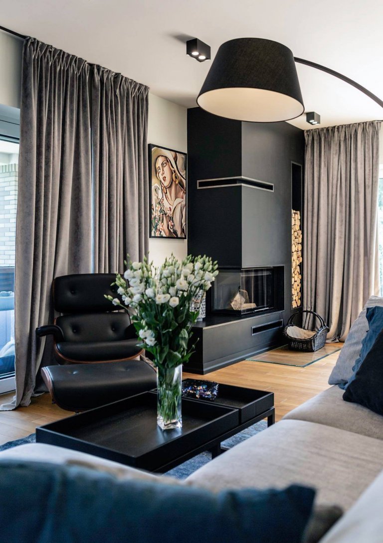 Ačkoliv je možné rozpoznat v tomto interiéru hned několik stylů, ten skandinávský zde hraje hlavní roli. Až na výjimky však opomíná typicky světlé odstíny, natož čistě severskou bílou, a vrhá se do kobaltově modré, hnědé, šedé a černé barvy. Může si to dovolit, protože celek umně prohřívá všudypřítomné dřevo. To je zastoupeno jak na parketách, tak v podobě polínek u krbu. Smělým prvkem ze dřeva jsou pak již zmíněné pařezy, které suplují konferenční stolky v relaxačním koutku obývacího pokoje. V podobném duchu byl pojat i věšák na oblečení umístěný v předsíni, jenž rovněž nezapře svůj lesní charakter.