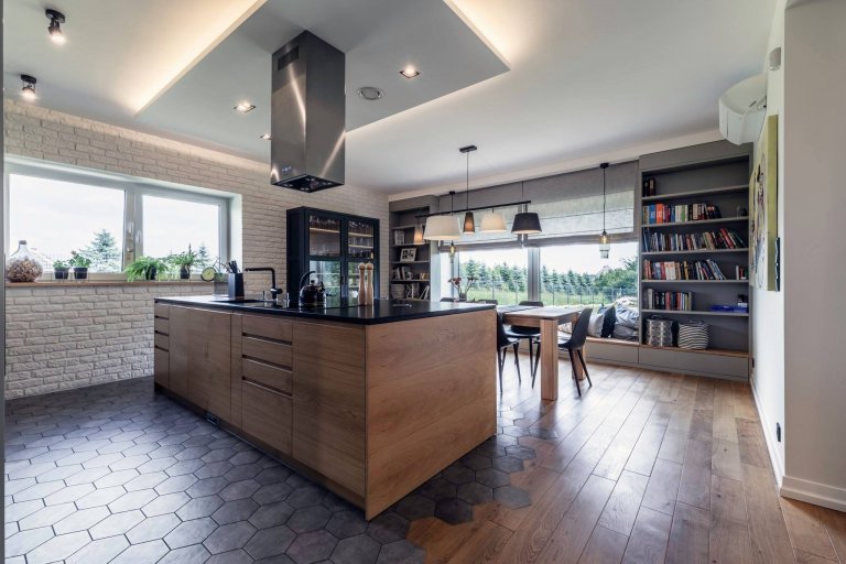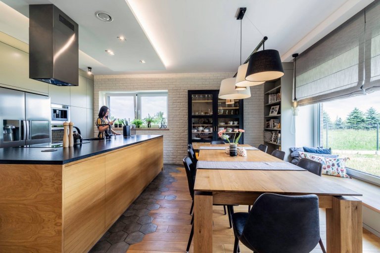 Právě sklo dodává interiéru tohoto domu na vzdušnosti a eleganci. Velká francouzská okna opticky zvětšují zdejší prostory. Jejich půvab pak podtrhují elegantní dlouhé závěsy spadající až na podlahu. V kuchyni jsou tyto závěsy vystřídány působivě pojatými moderními roletami. Ty jemně zastiňují příjemně vyhlížející koutek určený pro čtenáře i snílky nad okolní přírodou. S prostorem skvěle pracuje i samotná kuchyň, která díky své velkorysé velikosti nabízí neobyčejné možnosti pro pohodlnou přípravu jídel.