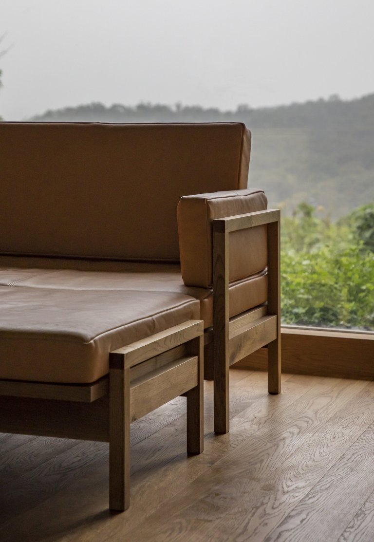 Cílem architektů bylo mimo jiné dodat vstupu do hlavního obytného prostoru dramatičtější ráz. Za tímto účelem došlo k prodloužení vzdálenosti od vchodu do obývacího pokoje. Obývací pokoj je široce otevřený směrem k východu a kolem něj je umístěn velký dubový rám, kterým dovnitř prostupují obrazy přírody. Právě průhledy do okolí plného zeleně jsou největší ozdobou celého interiéru, který se jinak nese v přísně minimalistickém stylu. Napomáhá tak k relaxaci obyvatel, kteří mohou trávit čas třeba u krbu s některou z knih ze zdejší velké knihovny.