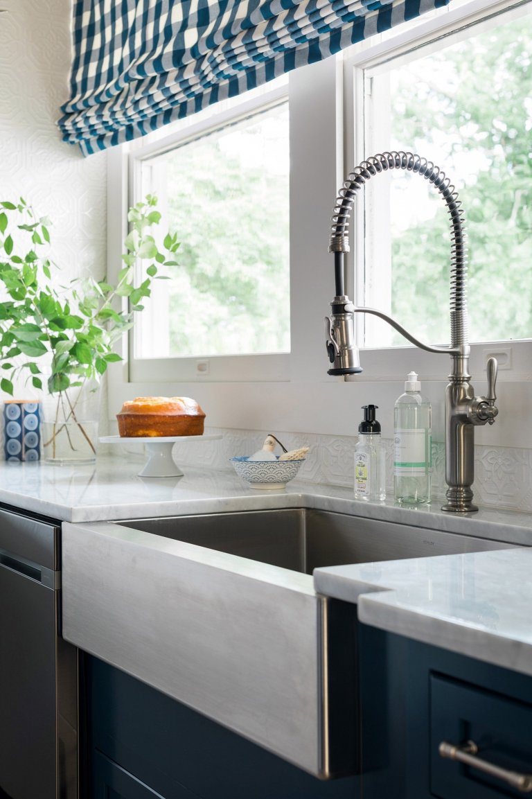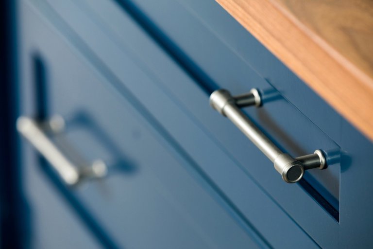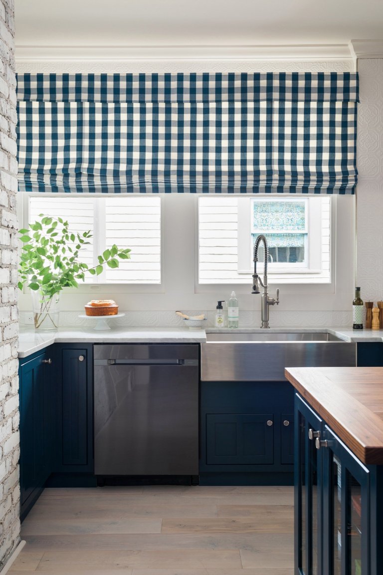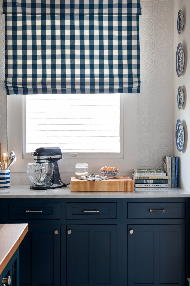 Tmavší odstín modré barvy dostal největší prostor v případě kuchyňské linky, stolu s úložnými prostory a také skříně se zabudovanými kuchyňskými spotřebiči. Objevuje se však také na zajímavě řešených modrobílých roletách venkovského rázu, na textilních doplňcích i na keramice. V tmavě modré barvě jsou vyvedeny i moderní kuchyňské židle, které tak příjemně ladí s vestavěnou skříňkou plnou nádobí s motivy ve stejné barvě.