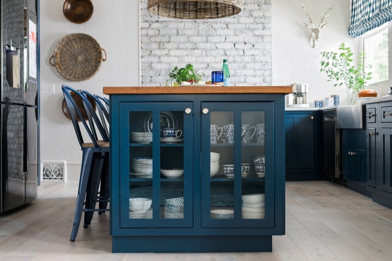 V téhle modré rustikální kuchyni nemá místo nuda ani špatná nálada. Působí vřelým venkovským dojmem, a přesto není vůbec zastaralá. Vařit se tu určitě musí jedna radost!
