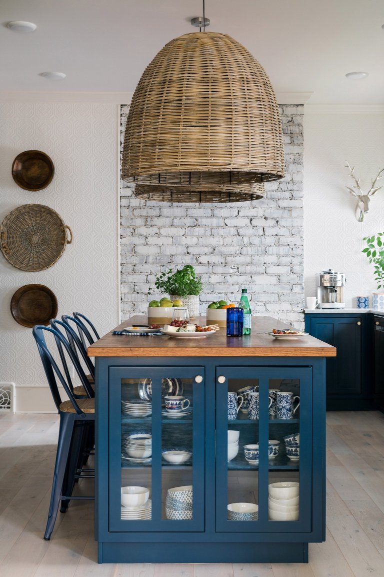 Tato kuchyně není útulná jen díky tak přitažlivému odstínu hojně využité tmavě modré barvy. Její komfort zvyšuje užití dřeva v případě podlahy i desky pracovního stolu. Velkou roli zde hraje také zeď obnažených cihel a v neposlední řadě i proutěné doplňky. Ty jsou zastoupeny především proutěnými lustry velkorysých rozměrů, které udávají modré kuchyni ten správný rustikální ráz. Dotek venkova je znát i z talířů s lidovými motivy suplujících obrazy nebo ze zajímavé jemné mozaiky pokrývající stěnu kuchyně kolem dokola.