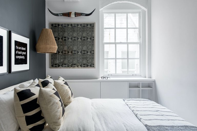 O něco klasičtěji už je zařízená kuchyňská část. Originálně a prakticky jsou řešeny také úložné prostory z části skryté za modrými dvířkami velké skříně v obývacím pokoji. Odvážným výstřelkem interiérové designérky se stala především ložnice utopená v černobílé kombinaci barev. Výrazný nádech ethno stylu zde bravurně doplňuje záliba v geometrii. Druhá ložnice si libuje ve světlejších barvách a také v inspirativních nápisech nad čelem postele. Odvaha pak nechybí ani vtipně zařízené koupelně, ve které tradice nedostala příliš velký prostor k uplatnění.