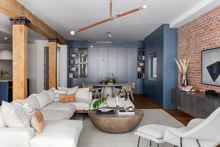 Modré tóny a odhalená cihla loftu v New Yorku
