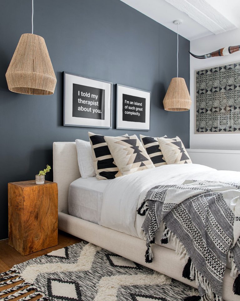 Když si noví majitelé loft koupili, byl ve velmi dobrém stavu. Jedinou překážkou bylo, že si jeho bývalý majitel potrpěl na minimalistický design, a tak vlastně koupili velkou bílou krabici vcelku bez nápadu. Bylo tedy zapotřebí interiér loftu zútulnit a zároveň trochu poodkrýt jeho skutečné charisma. Ashlie se proto rozhodla odhalit původní cihlovou zeď, která rázem dodala obytnému prostoru typicky půdní vzhled. Majitelé si navíc přáli, aby interiér loftu působil pánským dojmem, a tak v něm dostaly místo sametově modré tóny, industriální prvky a dřevěné detaily, které celek příjemně prohřály. V pozoruhodné kombinaci industriálního, rustikálního a ethno stylu tak vznikl útulný a velice nápaditý podkrovní byt.
