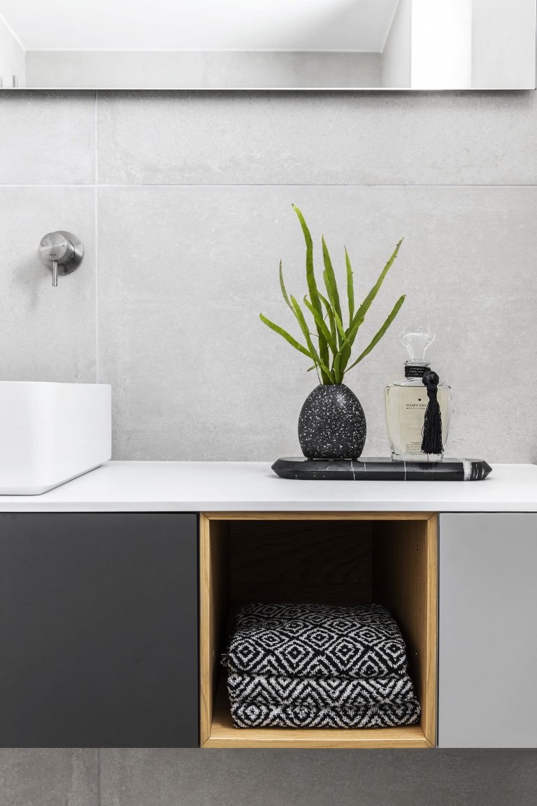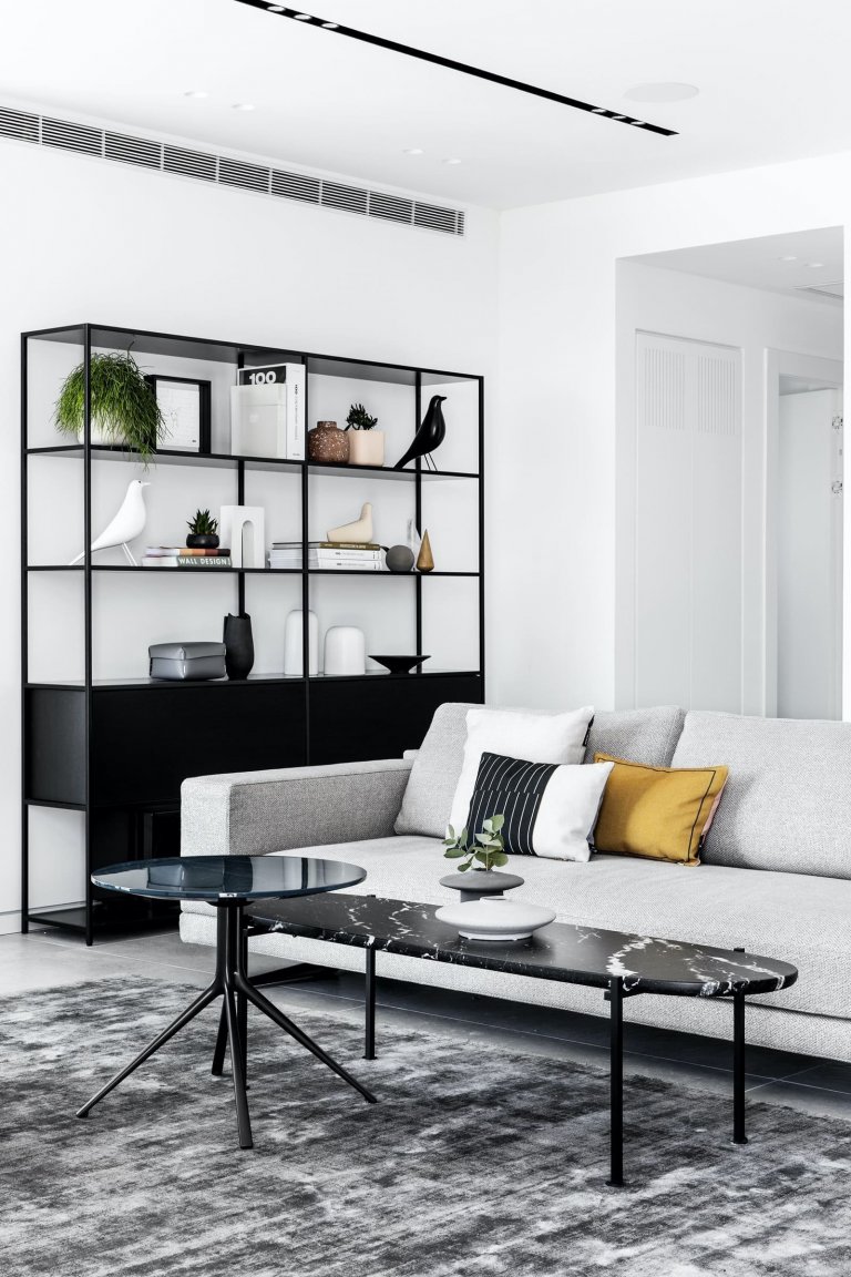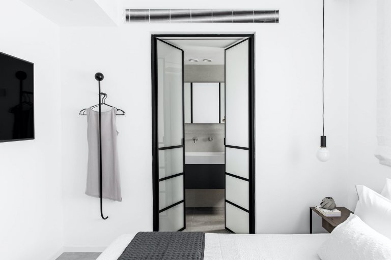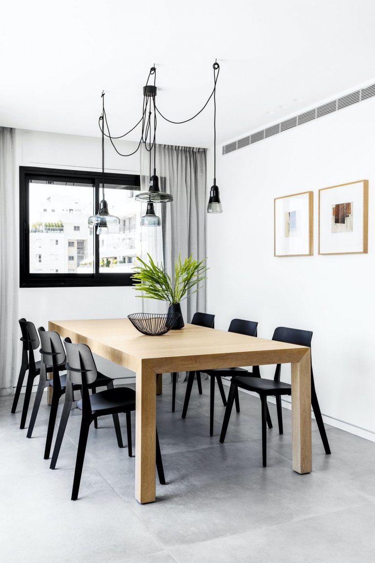 Kombinace černé a bílé barvy patří mezi charakteristické znaky tolik populárního minimalistického stylu. Elegance a jednoduchost těchto barev totiž dokáže podtrhnout čisté struktury nábytku a dekorativních prvků. A jinak tomu není ani v tomto izraelském apartmánu. Představuje barevnou paletu odstínů, které se pohybují od bílé přes šedou až k černé. Obzvláště kontrastní barvy si užívají velká okna přinášející do interiéru dostatek denního světla. Z ostře bílé zdi na pozadí vystupují černé rámy oken, a tak strhávají pozornost obyvatel domu a jejich hostů na úchvatný výhled do parku. Monochromaticky laděný interiér příjemně rozbíjejí osobité tyrkysové a bronzové akcenty. Zatímco klasická kombinace černé a bílé barvy tak vnáší do interiéru nádech severské atmosféry, tolik potřebný v horkých měsících, svěží barvy dodávají tomuto bydlení tu správnou energii.