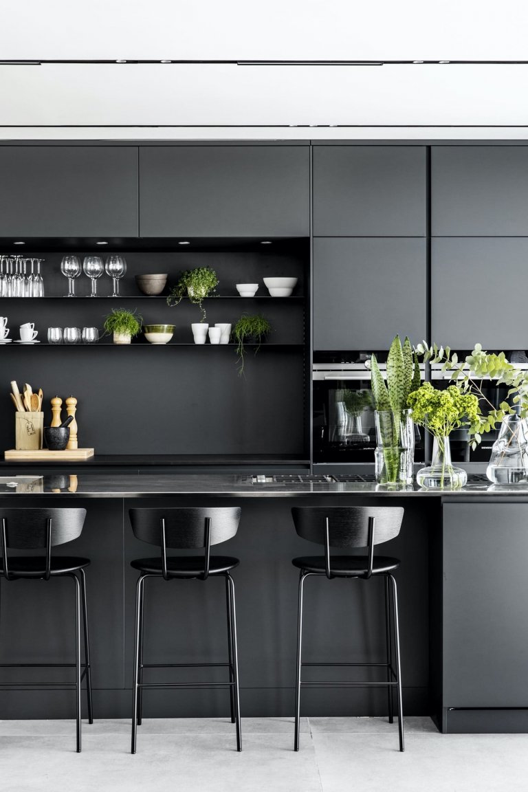 V prostoru plném něžné bílé a dramatické černé barvy na první pohled zaujme tmavá kuchyňská linka. Ta si svůj dramatický ráz může dovolit jak kvůli převaze bílé barvy ve svém bezprostředním okolí, tak díky velké prosklené ploše po svém boku. Nevzniká tím pádem tmavý kout a kuchyňská zóna může tedy vyniknout ve vší své minimalistické kráse. Interiér apartmánu, ale i balkón s úchvatným výhledem doplňují designové židle a stolky, které jsou opět věrné tradiční paletě barev. Prostor je maximálně světlý, čistý a vzdušný. Bílá výmalba v něm navíc vytváří pocit příjemné nekonečnosti.