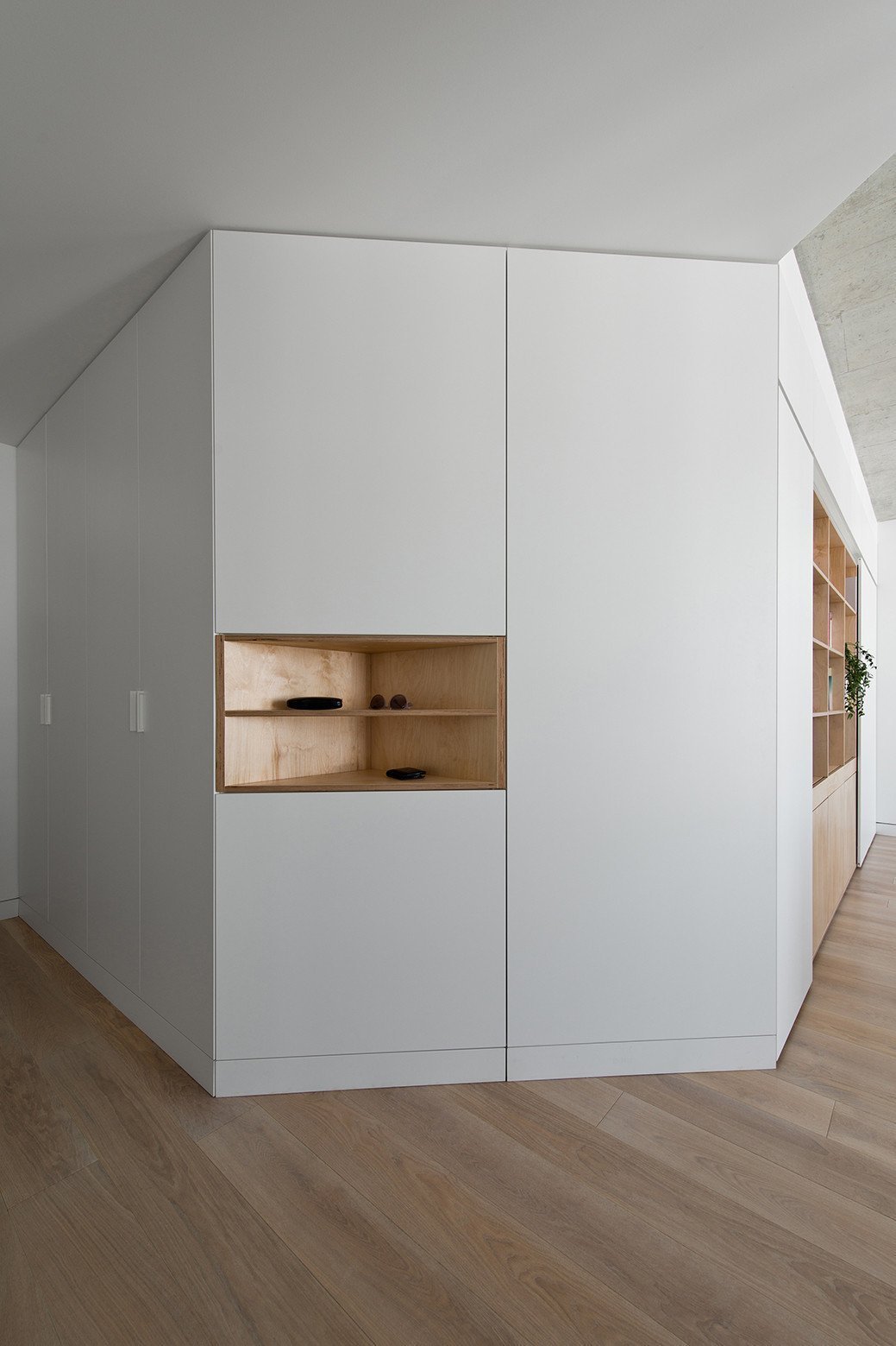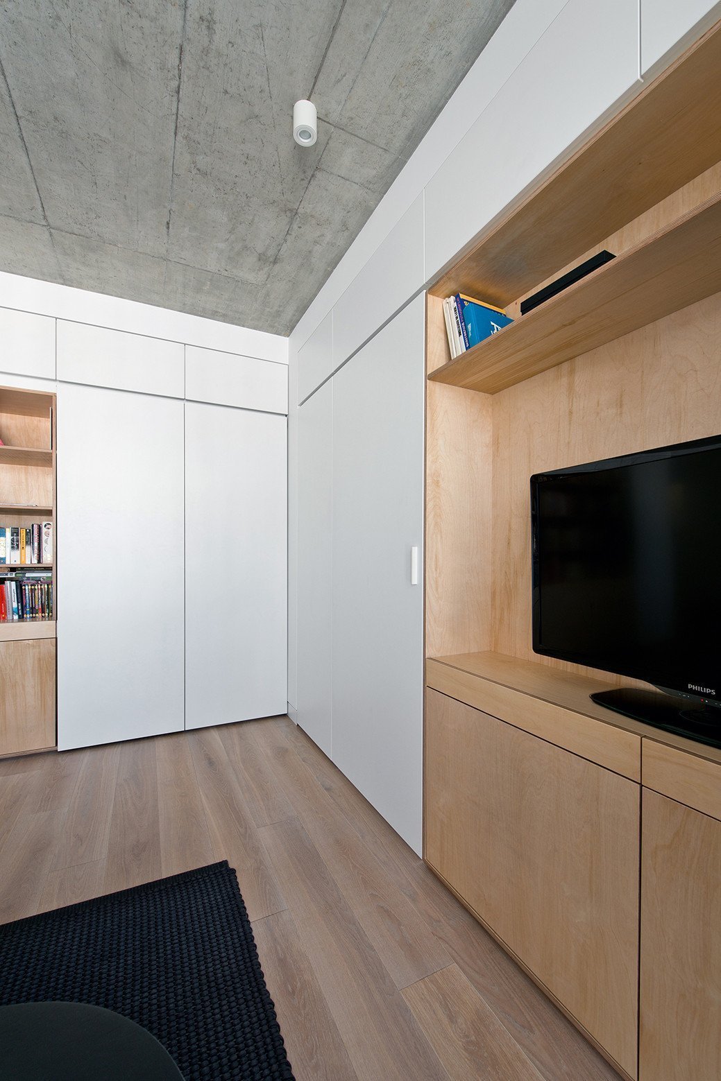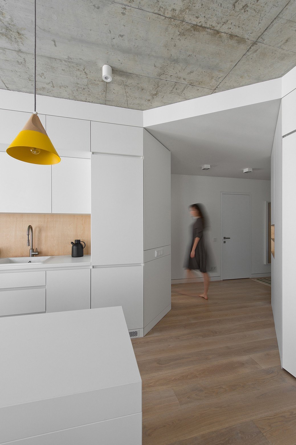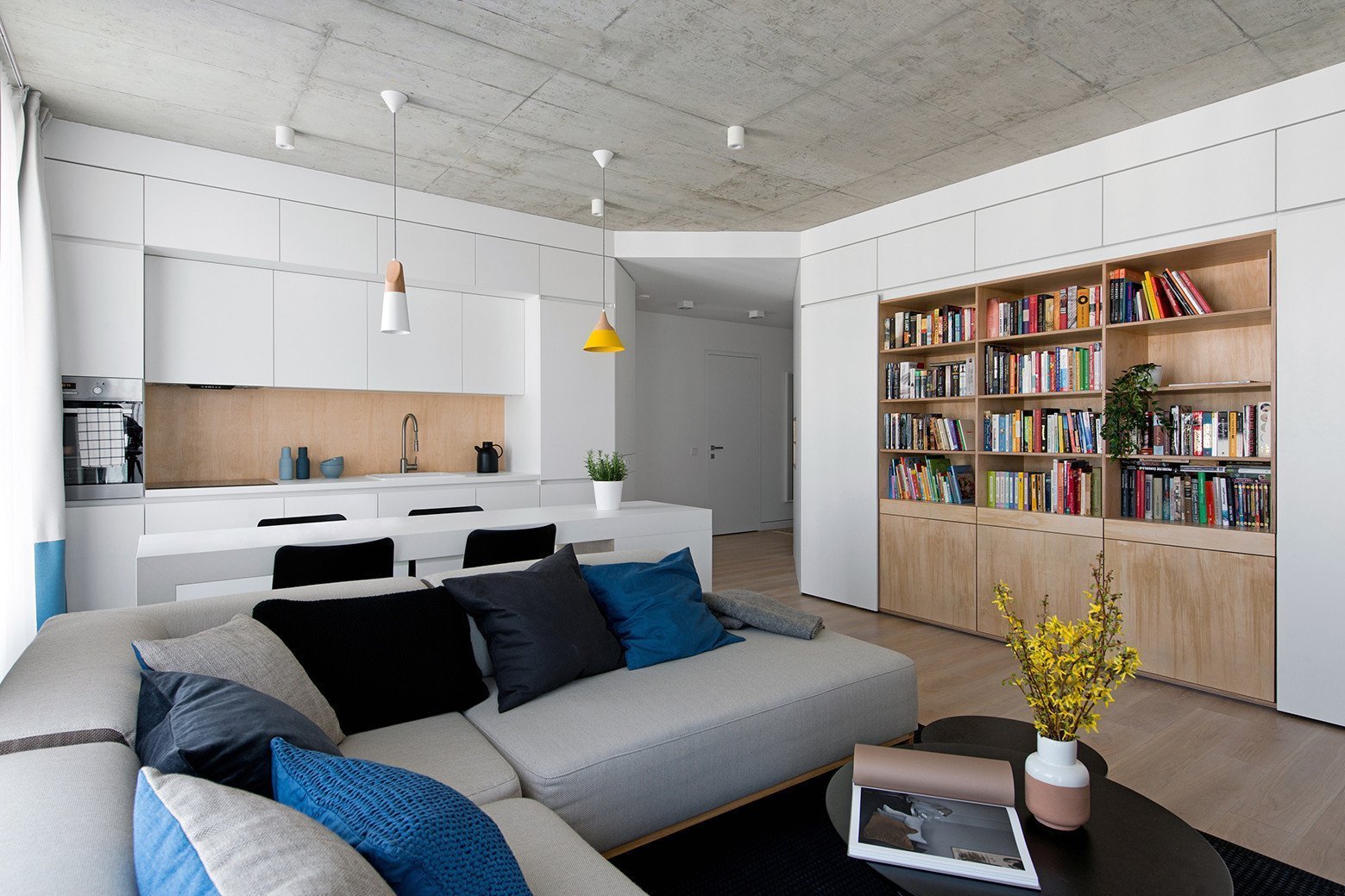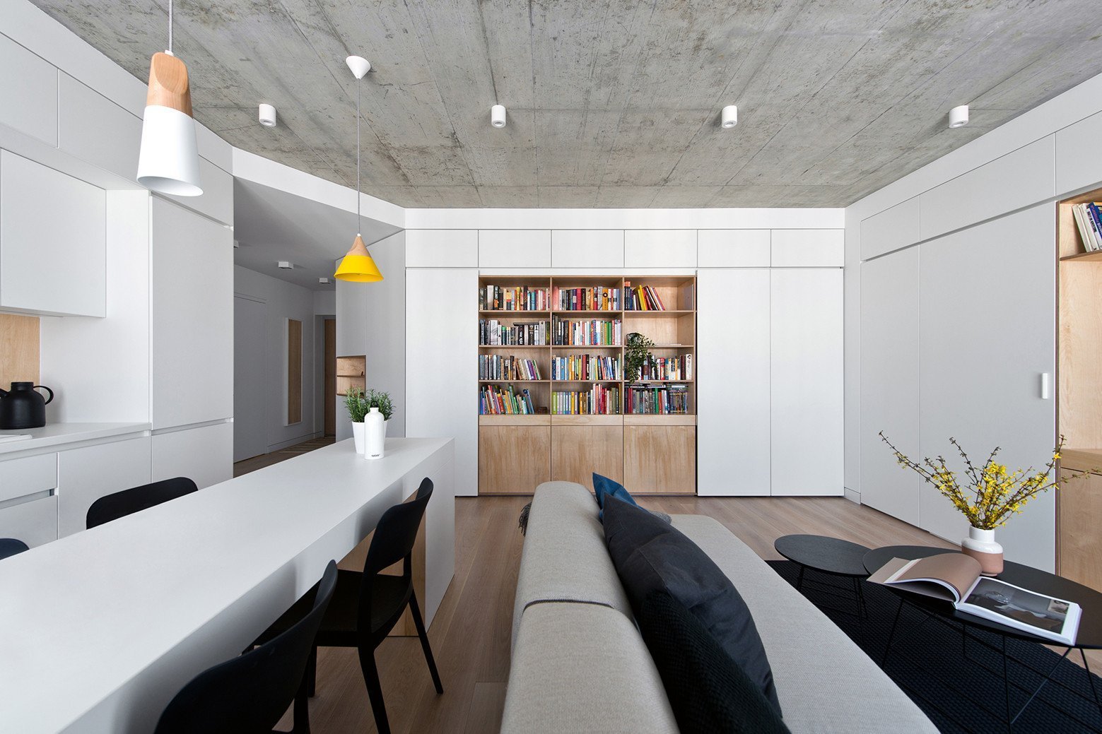 Byt se nachází v Litvě v městě Vilnius. Obytná plocha bytu činí pouhých 63,0 m². Přáním majitelů bylo zřídit především dostatečné úložné prostory. V obývacím pokoji je tedy otevřený policový systém z lakovaného dřeva, do kterého se vejdou stovky knih, protože majitelé jsou vášnivými čtenáři. Za posuvné dveře se podařilo schovat pracovní kout s počítačem. V hale je použitý úplně stejný policový systém, tentokrát ale uzavřený a slouží jako šatník. Ve stejném duchu byla na míru vyrobená dřevěná stěna v obývacím pokoji s výklenkem pro televizi. Bílé laminátové dveře pak oddělují obývací část od dětského pokoje. Velká okna poskytují majitelům panoramatický výhled na město. Trocha industriálu vstoupila i do interiéru. Návrháři se rozhodli nechat v bytě strop z hrubého pohledového betonu, který tak skvěle kontrastuje s bílými stěnami, dubovou podlahou a dřevěnými kusy nábytku.