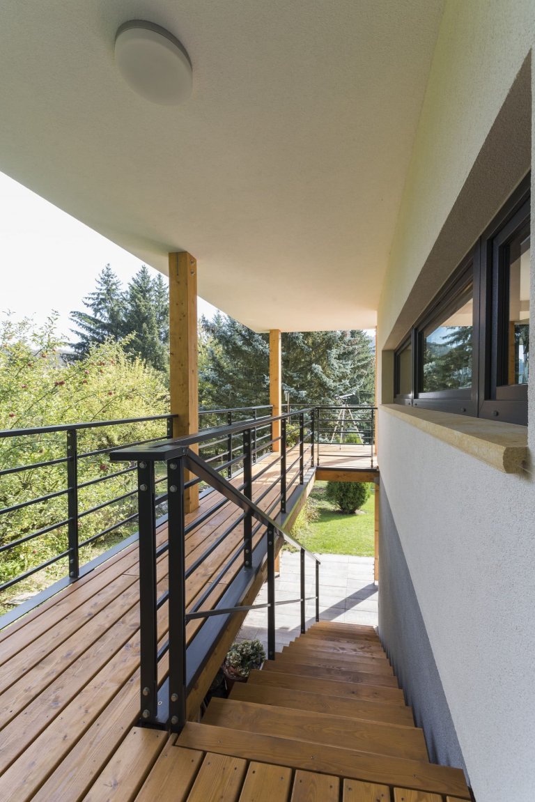 Jistá provázanost domu s přírodou je patrná z jeho nenáročného charakteru, který si přece jen v sobě i nadále uchovává něco z původní chaty. Působí skromně a decentně, přičemž jako by se spíše schovával mezi stromy, než aby na sebe přehnaně upozorňoval. Svému okolí je přitom dům uzpůsoben i tak, že díky jeho vstupům z jihu i ze severu lze vcházet do obou částí zahrady. Jednou z dalších pozitivních vlastností domu je rovněž jeho skromná výška, jež necloní výhledům z horní části zahrady. Propojení s přírodou pak napomáhá také terasa, která se nachází na severní straně domu. Ta doslova svádí k posezení ve stínu za příliš horkých dnů. Její přirozené kouzlo umocňují truhlíky plné květin. O komfort se zase stará pohodlný venkovní nábytek.