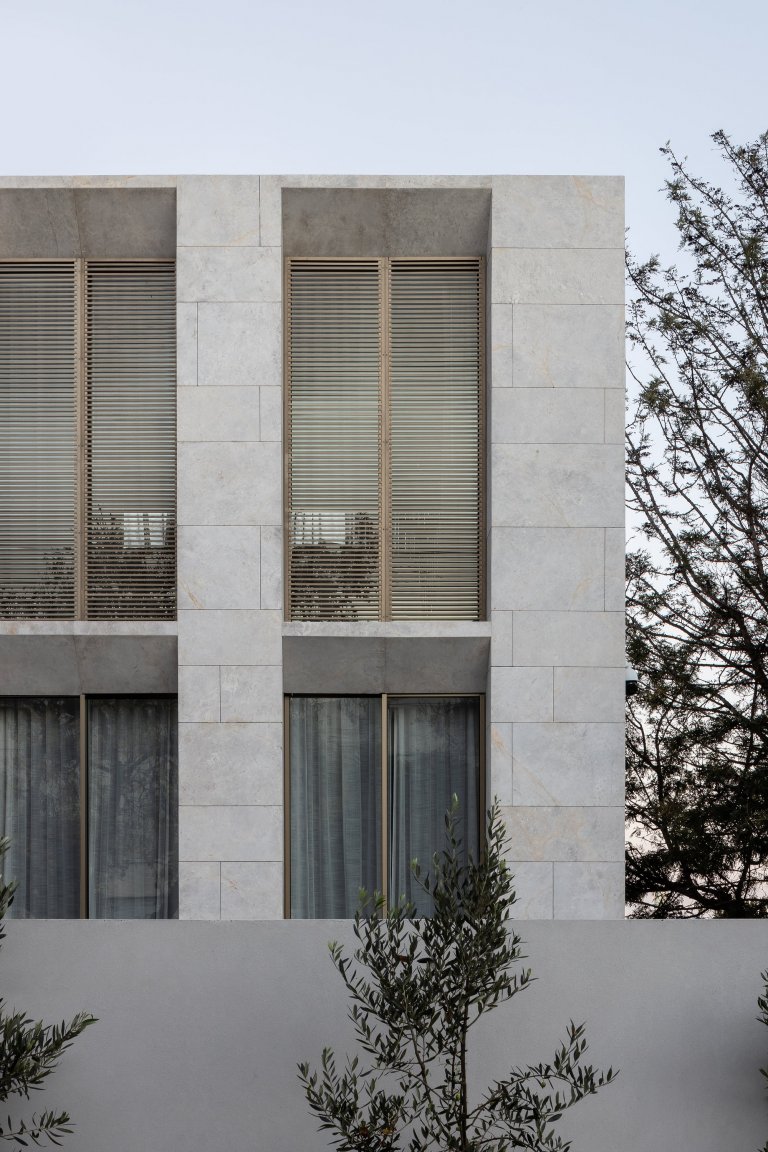 Velký důraz byl na přání majitelky kladen zejména na panoramatický výhled na město, zatímco zahrada vytváří pocit soukromí v ústraní. Jednou z mnoha dalších ozdob tohoto nadčasové bydlení je leptaný mramor, který o sobě dává vědět v exteriéru i interiéru. Vše, co bylo při budování této rezidence použito, ve výsledku a pohromadě vybízí k odpočinku a vychutnávání si každé volné chvíle. Ty lze trávit na terase nebo u bazénu, ale také v interiéru plném dechberoucích výhledů na město i do přírody. Návštěvy pak na první pohled zaujme celá řada designových prvků, ať už je to elegantní schodiště, volně stojící vana, umělá svítidla či moderní lehátka na terase. Interiér v černobílé kombinaci s šedými tony příjemně prohřívá světlý odstín dřeva, čímž navzdory striktně minimalistickému stylu vzniká naprosto útulné bydlení.