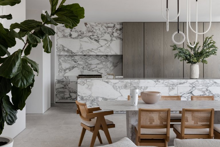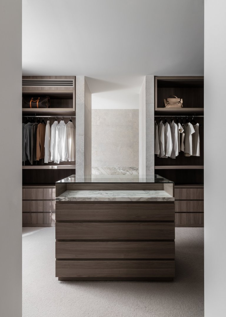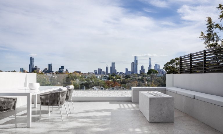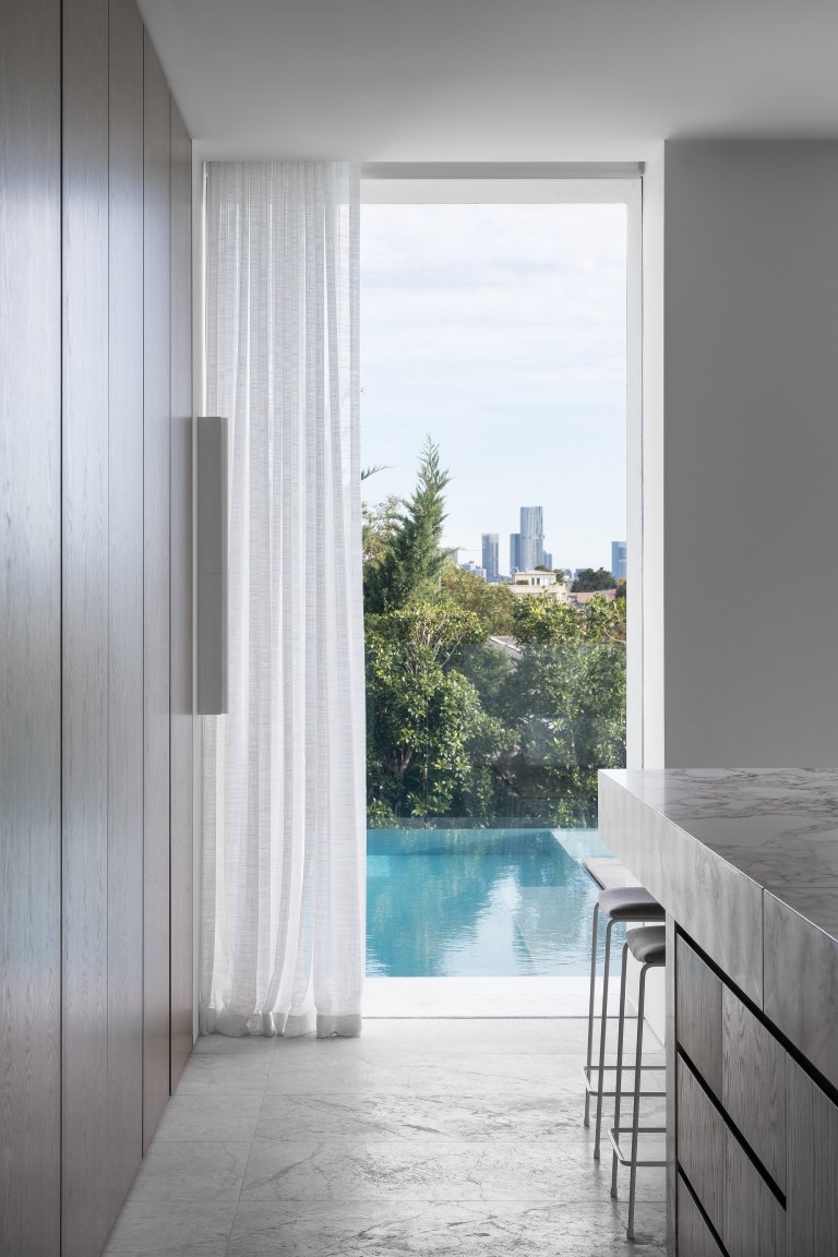 Za minimalistickým vzhledem rezidence stojí architekti z australského studia Conrad Architects a oslovila jej sama majitelka a zároveň interiérová designérka Lauren Tarrant, která s ním spolupracuje již delší dobu. Svůj nový domov si představovala jako nadčasovou rodinnou rezidenci osvěženou výhledy na město.