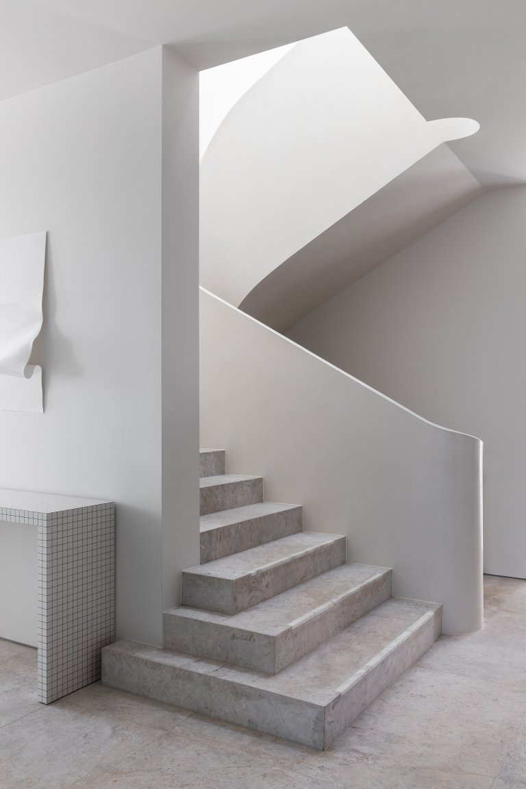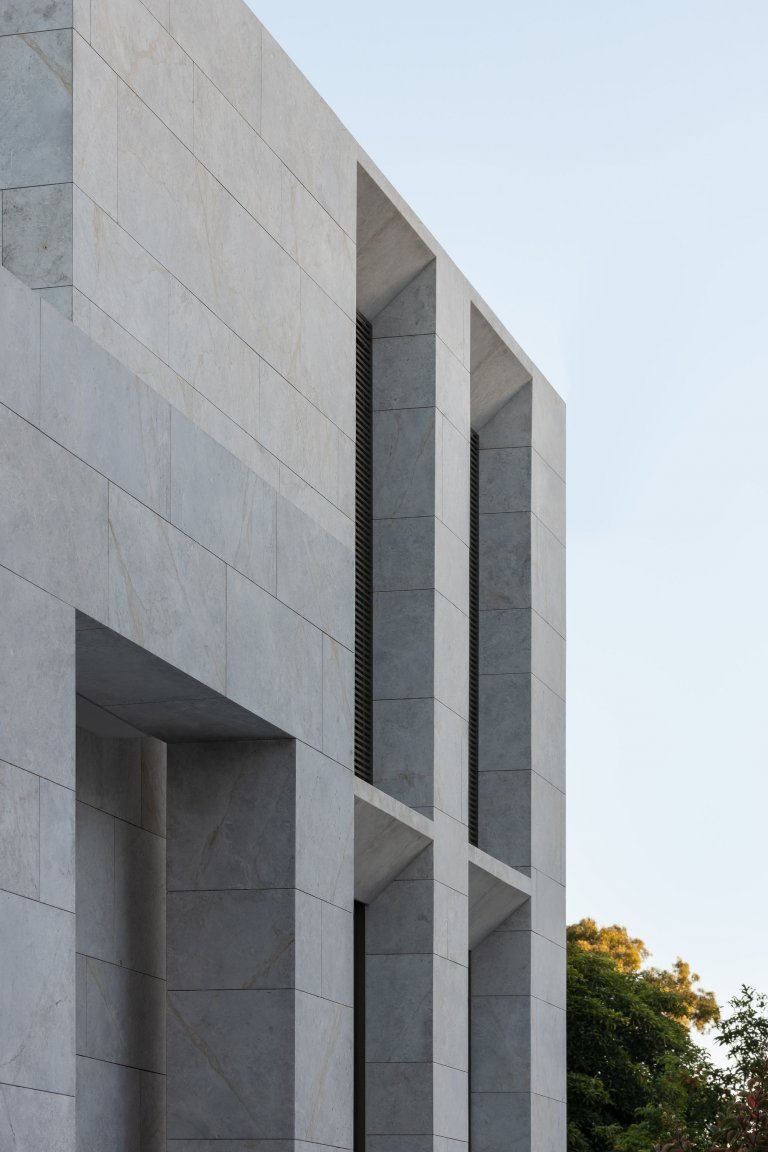 Forma minimalistických kamenných bloků je rozdělená na několik objemů, které jsou s exteriérem propojené velkými prosklenými plochami. Rezidence sestává ze čtyř úrovní, které zjednodušují pohyb po rozsáhlém a svažitém místě. Vzniká tak intuitivní a dynamická cesta. Značnou část návrhu tohoto bydlení tak určila samotná topografie. Došlo však ke zvýraznění vstupu do domu a pohybu po něm.