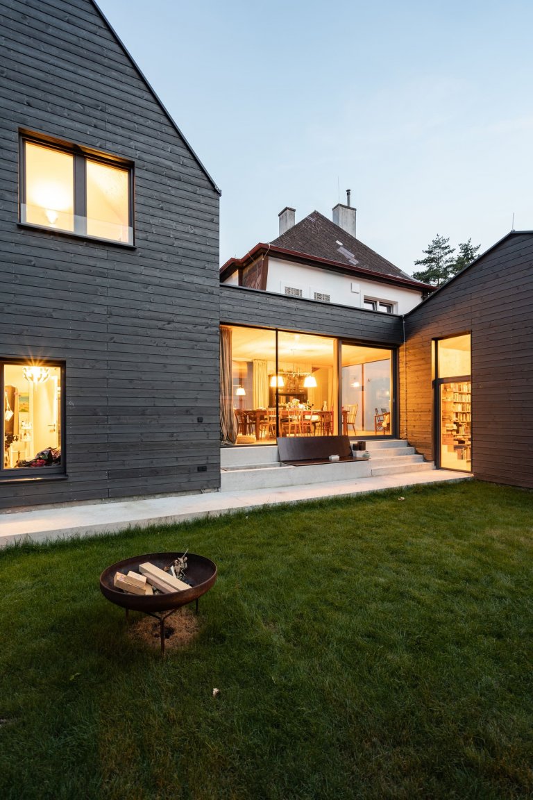 Jelikož je kuchyně srdcem každého domu, tak i v tomto případě zůstává ve staré části bydlení. Současně je ale po boku nově přistavěné jídelny. Jednotlivé místnosti se v interiéru příjemně prolínají a vnitřek jakoby teče. Rodina se tak setkává přímo v srdci domova. Díky důmyslnému členění stavby vznikl kolem domu půvabný venkovní prostor. Svádí k relaxaci i aktivnímu odpočinku. Staré a nové na sebe příjemně navazuje, ale nechybí zde ani přitažlivé kontrasty, o něž se starají zejména zcela různorodé fasády. Původní dům je omítnut bíle, přístavby jsou zase obložené dřevem a hojně prosklené. Vzniká tak vskutku zajímavá podívaná na symbiózu starých a nových časů.