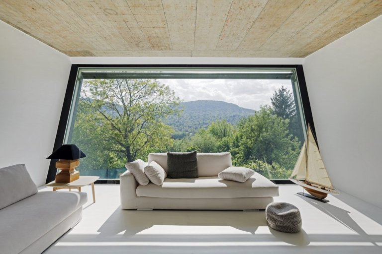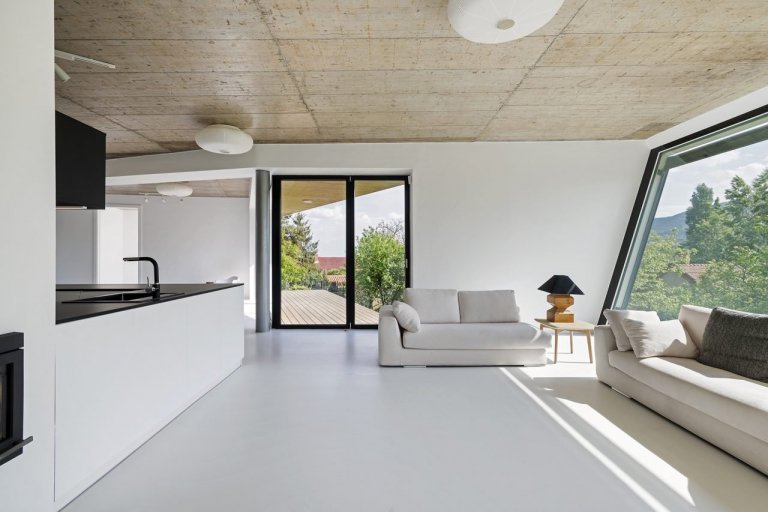 Dům se snaží co nejvíce otevřít přírodě. Jeho obyvatelům se tak může zdát, že jsou uvnitř a zároveň venku. Obytný prostor domu na svažitém pozemku je přístupný ze zahrady, a to pomocí venkovního krytého schodiště. Architekti kladli důraz zejména na zvýraznění nádherného panoramatu, které se otevírá k sousedním horám a údolím. Úchvatné výhledy umožňují obrovské prosklené stěny domu. Bílá podlaha z pryskyřice a pohledový betonový strop v interiéru zajišťují, že se pozornost upíná na přírodu za okny. Pozoruhodné řešení zde představuje skloněný skleněný povrch obývacího pokoje. Obývací pokoj je orientován na jihozápad, a tak lze z velkého okna dennodenně obdivovat západ slunce. Naklonění povrchu je reakcí na prosvětlení místnosti letními paprsky. Úhel sklonu byl zvolen kvůli propouštění světla během zimy, kdy bývá úhel dopadu slunečního záření nižší.