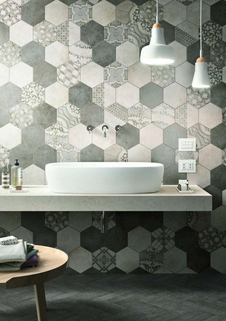 Při pohledu na letošní nabídku obkladových materiálů neuniknou vaší pozornosti netradiční tvary obkladů a dlaždic. Velkým trendem poslední doby jsou například hexagony, tedy šestihranné dlaždice připomínající včelí plástve, s kterými vytvoříte zajímavé obrazce. Stěna pokrytá těmito originálními obklady vytvoří dominantu celé koupelny a vnese do prostoru jedinečnou atmosféru. V případě malých koupelen volte šestiúhelníkové dlaždice v neutrálních barvách.