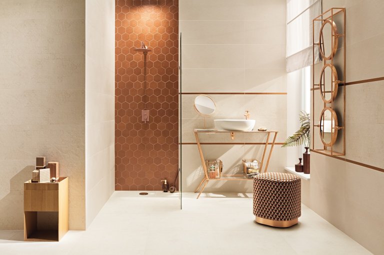 Mezi základní prvky série patří krémově bílé obklady ve větším formátu 33 × 90 cm, které snadno zkombinujete s dekorativními prvky v podobě hexagonové mozaiky nebo listely právě v imitaci mosazi. Série je navíc doplněna moderní mrazuvzdornou rektifikovanou dlažbou ve formátu 59,8 × 59,8 cm.