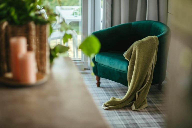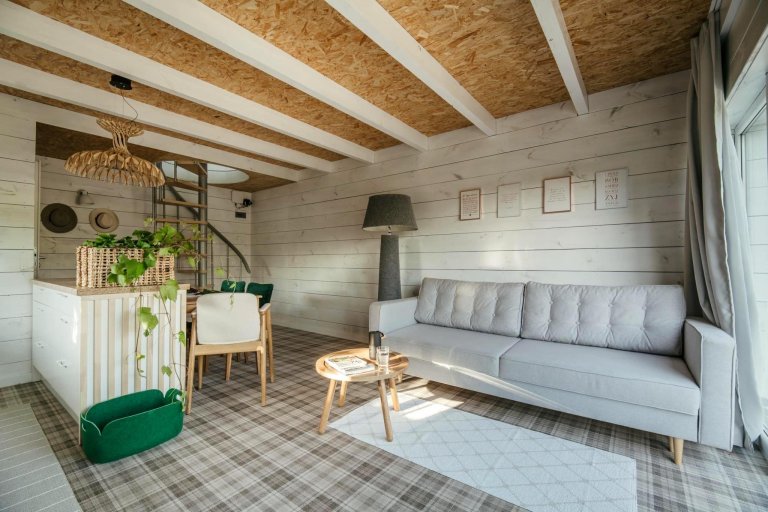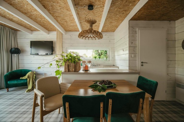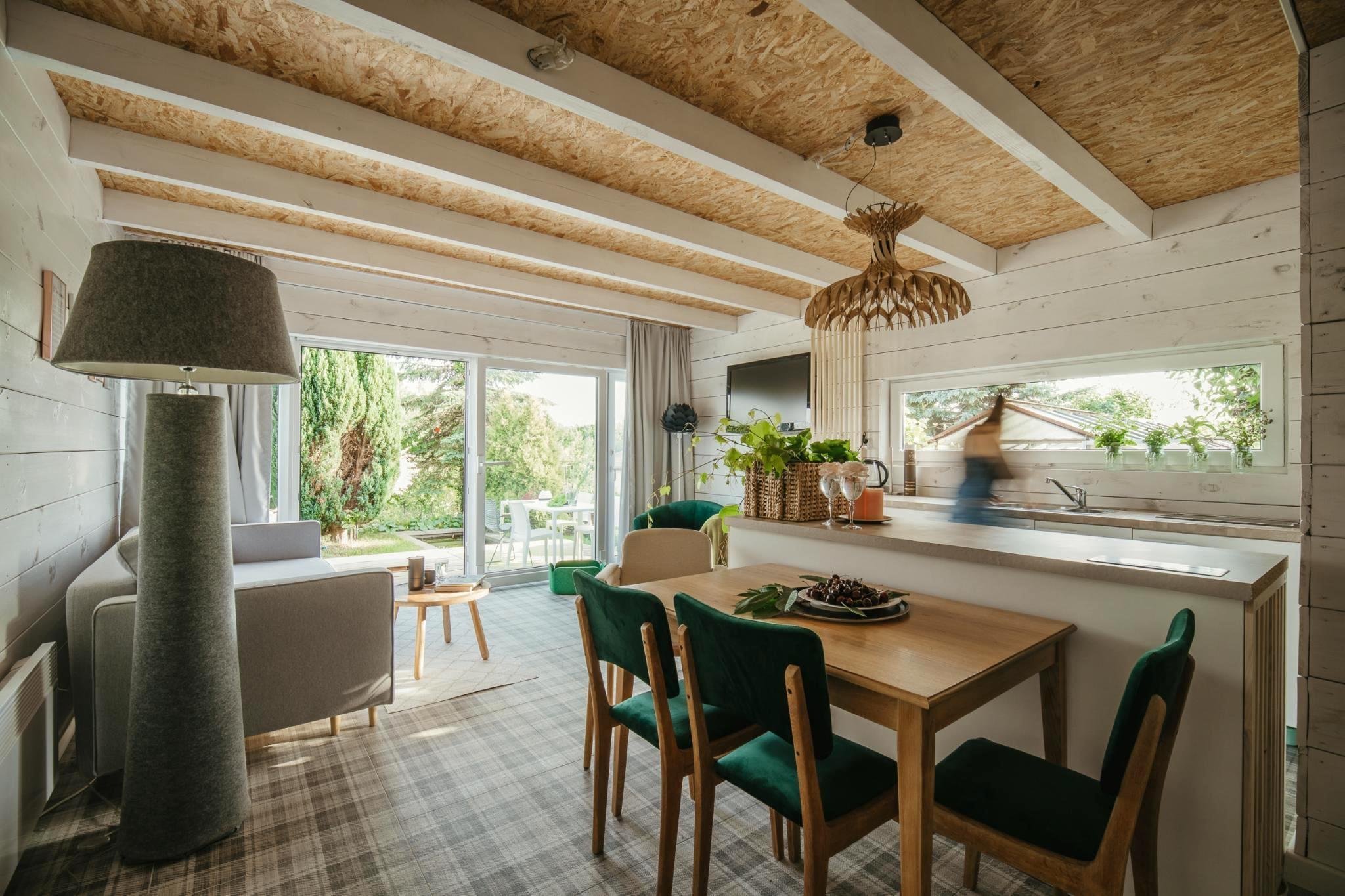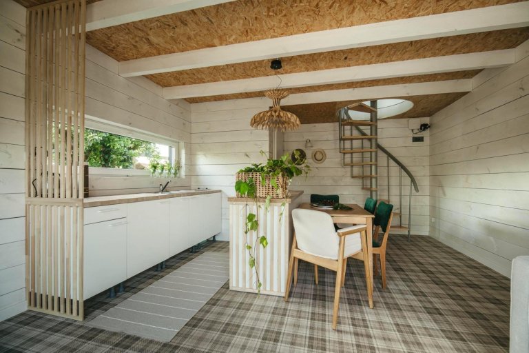 Letní dům má dvě úrovně, přičemž každá z nich zaujímá plochu o velikosti 35 m2. V první se nachází obývací pokoj propojený s kuchyní a jídelnou, v druhé ložnice. Díky půvabně zařízenému interiéru mohl vzniknout domov připomínající ten, který si Monika pamatuje ze svého dětství. O příjemně hřejivou atmosféru se v něm stará nábytek s duší evokující nábytek prarodičů. Se stolem a židlemi se zeleným čalouněním koresponduje nejen plyšové křeslo, ale i měkké textilie a zeleň v interiéru, kterou doprovází ta, jež je vidět za okny.