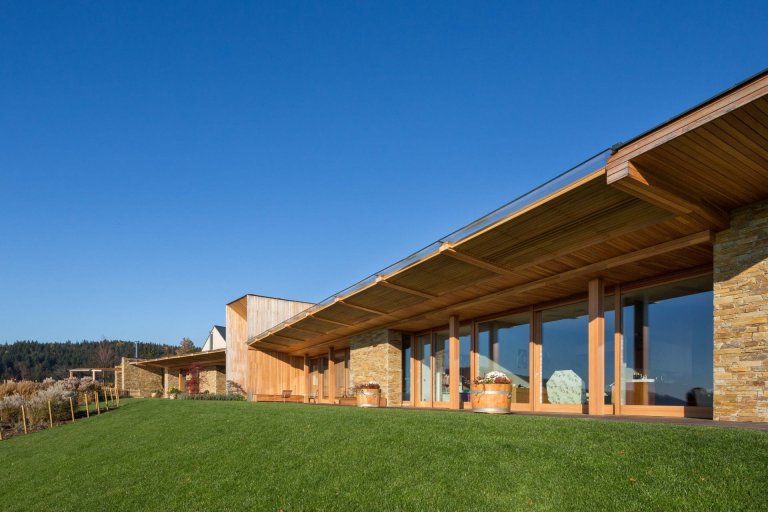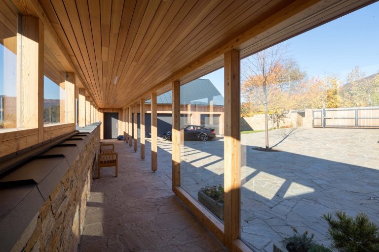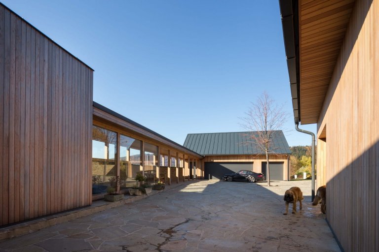 Na první pohled zaujmou jednoduchým a tradičním způsobem řešené hospodářské prostory domu s příjezdovým cestou, kterou vymezují objekty jako technické zázemí či garáže. Navíc tudy vede otevřená krytá chodba, jež lemuje zelení osázenou střechu obytné budovy, která není na první pohled patrná. Obytná část domu se totiž z velké části nachází pod zemí. Tvoří ji dvě vůči sobě mírně zalomená křídla, ve kterých je situována společenská a odpočinková zóna.