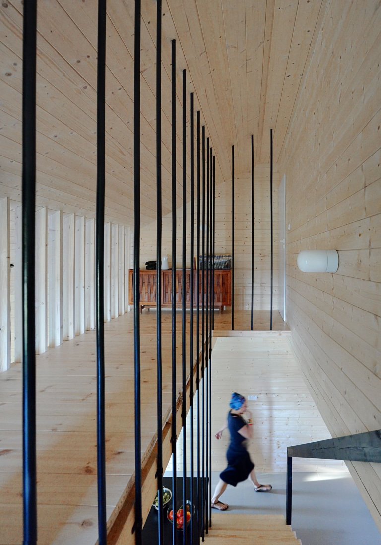 Budova má skeletovou strukturu a byla postavena týmem profesionálů, kteří se na tento typ stavby specializují. Hlavním zdrojem bylo místní dřevo borovic, které se v této části Polska tradičně využívá. V současné době je dům využíván hlavně v létě, ale snadno se v něm dá žít celoročně. V obývacím pokoji je krb s rozvodem, je zde také další elektrické topení. Výhodou dřevěné skeletové struktury je, že neexistují žádné tepelné mosty a interiér se rychle zahřívá. Na 67 m2 je prostor využit tak, aby se tam vešlo vše, co má v domě být. V přízemí najdeme na jedné straně centrálně umístěných schodů obývací pokoj spojený s jídelnou a kuchyňským koutem s přímým vstupem na terasu, a na druhé straně je WC, koupelna a hlavní ložnice. Nad nimi, pod asymetrickou střechou, jsou dva pokoje pro hosty a mezipatro. Design interiéru odpovídá fasádě s tím rozdílem, že borovicové desky zakrývající vnitřní stěny a strop si zachovaly svou přirozenou barvu, jako kontrast vůči venkovní fasádě.