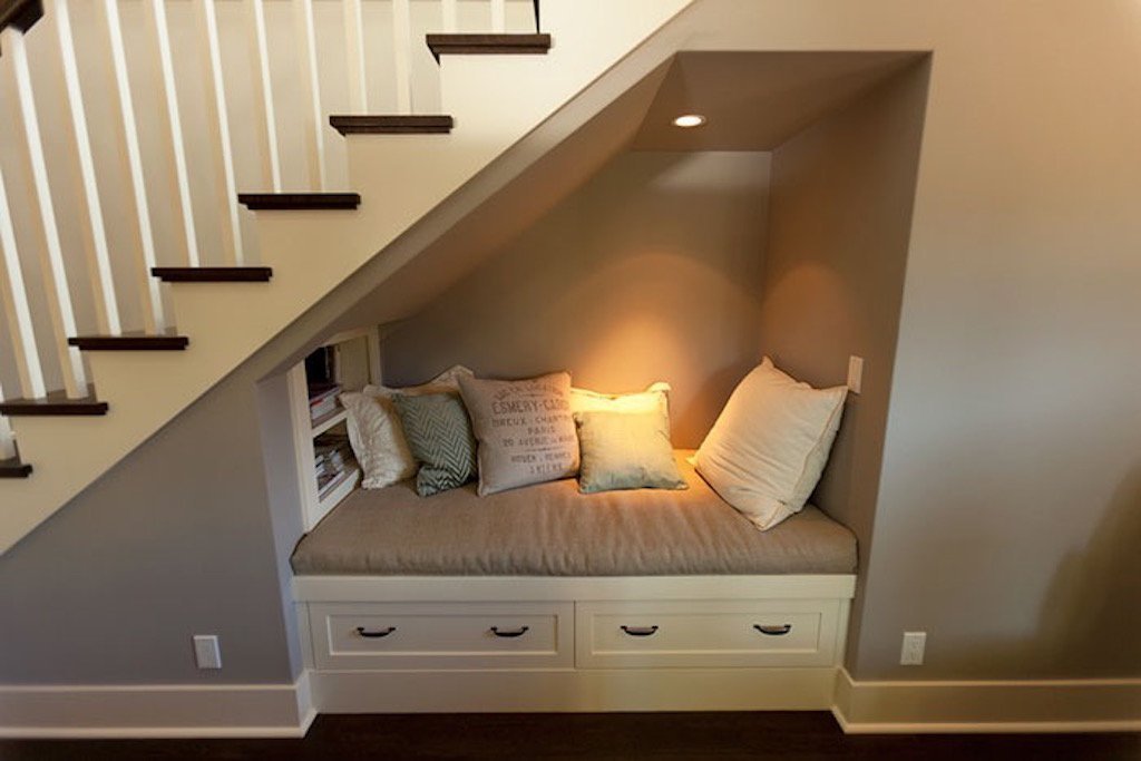 Nevíte jak využít prostor pod schody? Inspirace jako z Harryho Pottera. Malý výklenek vytváří malou skrýš. Až si tam sednete, v tichu a touze pohroužit se do svých knih, vězte, že obklopeni polštáři se vrátíte do dětských let. Do dob, kdy jste se v posteli, v polštářích a s peřinou nad hlavou tajně schovávali a po nocích dočítali všechny ty napínavé příběhy.