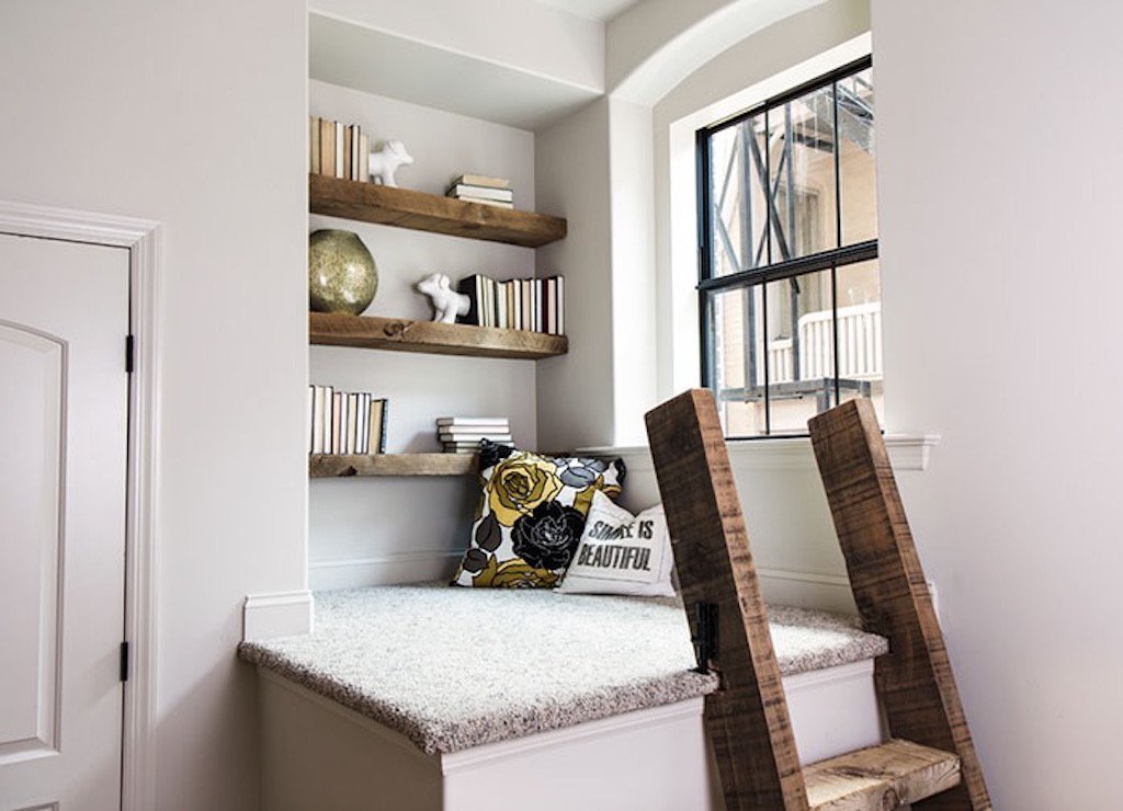 Pevný nábytek, vysoký sokl, skříň, … využít lze opravdu vše. Nejen že máte úložný prostor, ale současně i malou knihovničku s posezením. Čistý bílý koutek je decentně doplněn a zútulněn za pomoci dřevěných prvků - polic i žebříku. A i to malé okýnko má své využití. Dopřává čtenáři dostatek denního světla, ale i výhled ven.