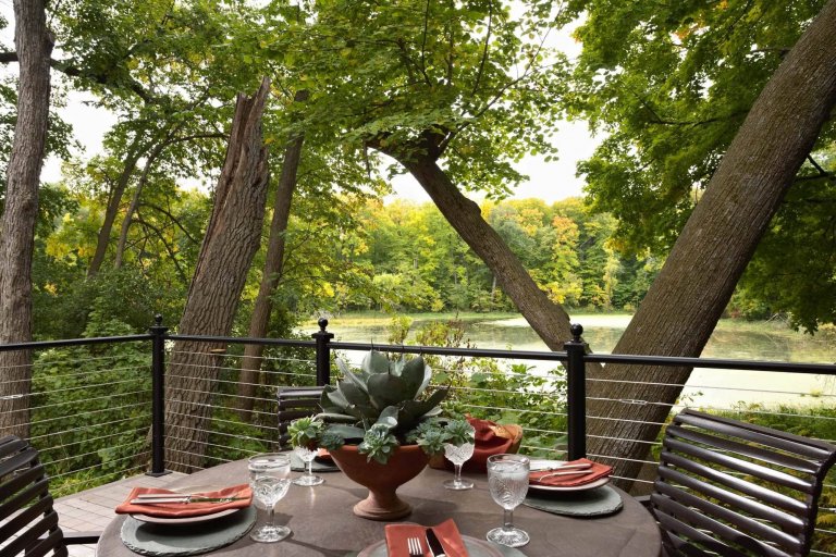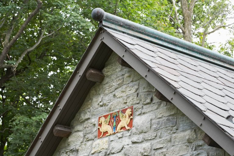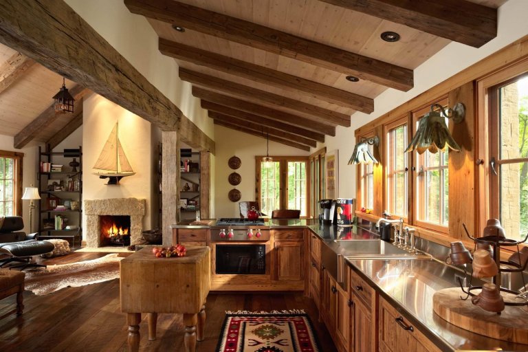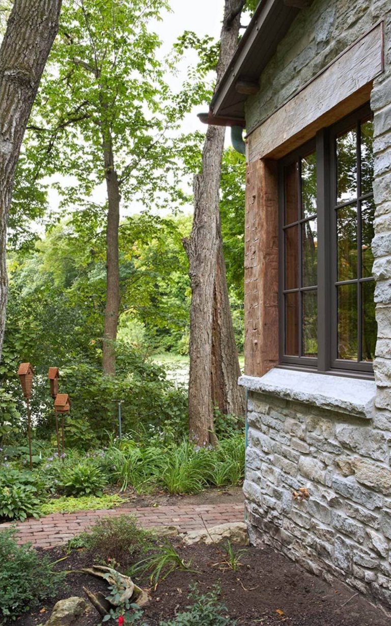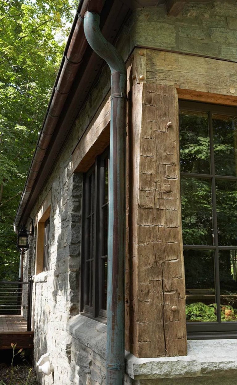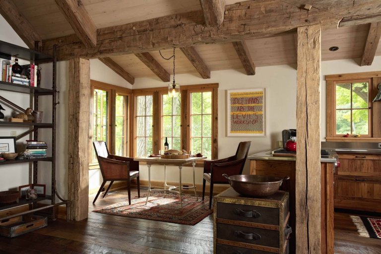 Většina viditelného dřeva byla recyklována ze stodol z období kolem poloviny 18. století. Břidlicová krytina je ještě starší a původně pokrývala stodolu v Pensylvánii postavenou v roce 1810. Vápenec použitý na vnější straně byl zachráněn z mola mostu z roku 1889 v Minneapolisu. Mnoho vybavení a příslušenství pochází ze sbírky majitele starožitností, včetně svítidel, dřevěných dveří v ložnici, komína a dlaždic, které zdobily přední štít. Jedna strana pokoje lemuje jednu stranu domu a střecha byla trochu rozšířena na jedné straně, aby se našel prostor pro jídelnu a kuchyňský kout.