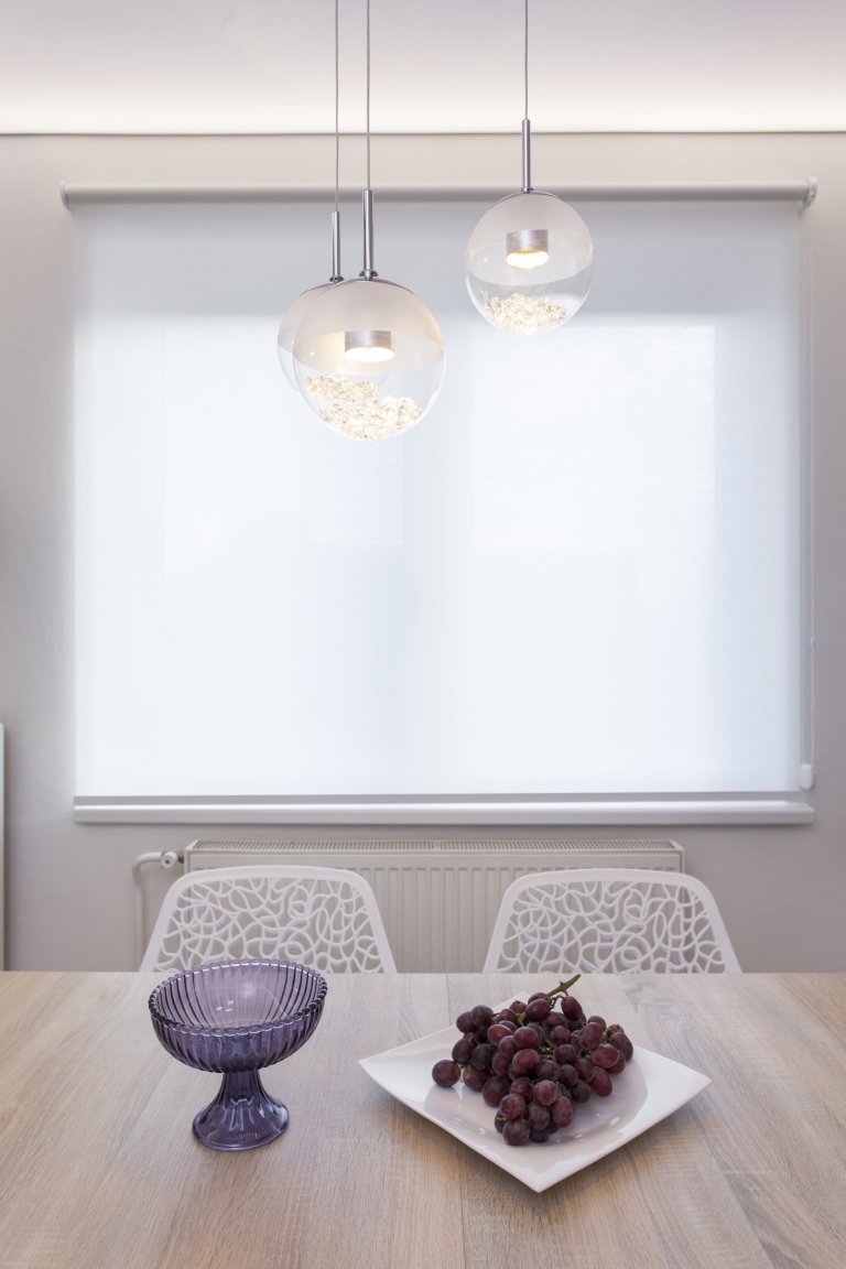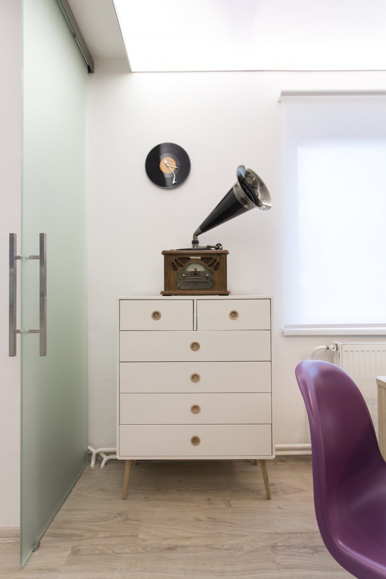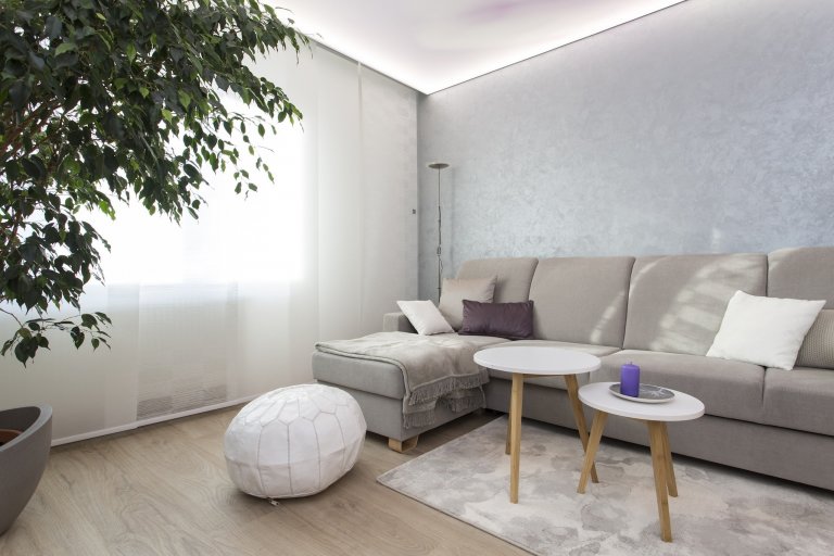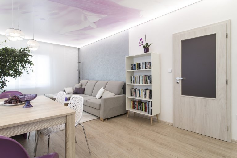 Designéři hledali barvu, která by se zde nejvíce hodila. Od dcery paní Barbory zjistili, že má ráda moderní styl, uzavřené skříně, hladké povrchy a také Francii. Tady vznikl nápad fialové barvy levandulí, která se promítla v prvcích interiéru. Pro rozzáření prostoru použili osvětlené napínané podhledy s motivem květiny a také LED pásky u kuchyňské linky. Stěnu za sedačkou opatřili stříbrným štukem, který kontrastuje s grafikou na stropě.