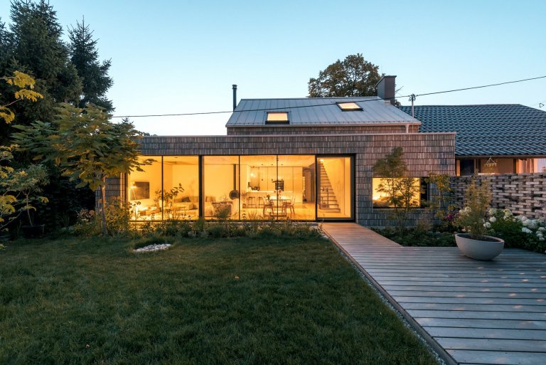 Novostavba, která nahradila původní rodinný dům, však na svého předchůdce nezapomíná. Její vzhled totiž plně respektuje archetyp dvojdomku se sedlovou střechou. Směrem do ulice tak nový dům příjemně zapadá mezi sousední obydlí, aniž by se na sebe snažil upozornit. Z části ukrytý za stromy a keři vyhlíží do ulice jen několika málo okny, zato do zahrady mnohem více předvádí invenci architektů. Nadále ctí odkaz bývalého domu, obyvatelům však nově poskytuje mnohem více prostoru pro život. Původní užitná plocha o velikosti 88 m2 se rozrostla na velkorysých 150 m2, a to díky přístavbě a využití podkroví.