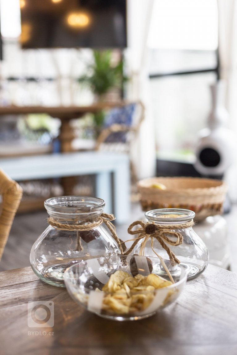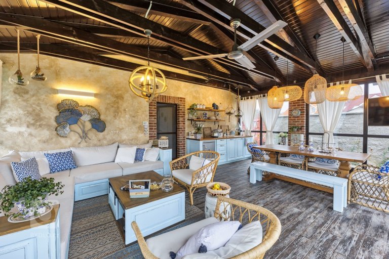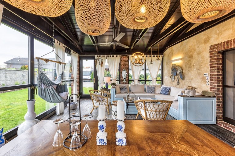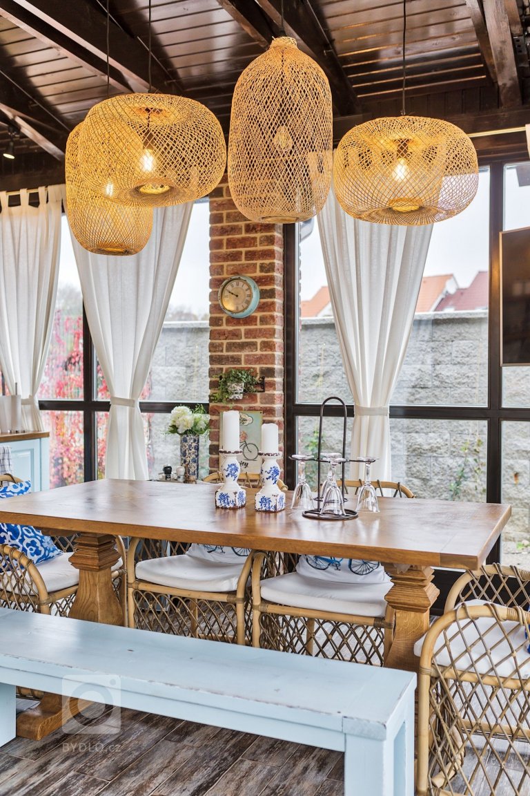 Obytné prostory jsou částečně otevřené a nesou se v přátelské atmosféře. Hlavní slovo má masivní dřevo, zemité odstíny, modré akcenty, pálené cihly a suvenýry z cest, sloužící jako dekorace. V domě jsou tři pokoje, dvě koupelny, obývací pokoj spojený s kuchyní a naprosto úchvatná zimní zahrada. Ta bývala dříve pouze terasou, ale majitelé ji chtěli obývat celoročně a mít pocit, že jsou právě v přímořském letovisku. Zimní zahrada má velkorysých 35 m2 a je v ní vše potřebné pro relax. Prostorná sedačka, masivní jídelní stůl i kuchyň a maximální výhledy do zahrady. Zimní zahrada má velké výsuvné dveře, které po otevření spojí prostor se zahradou. Závěsná křesla umožňují relax v zahradě i v blízkosti zázemí domu.