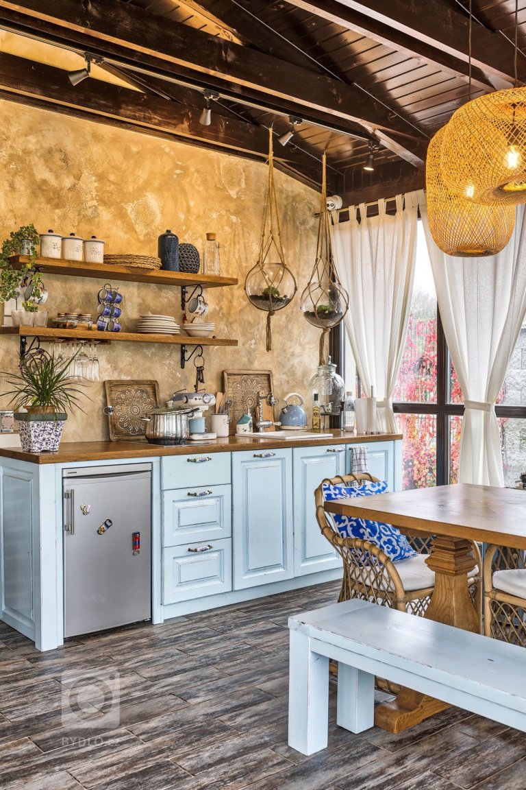 Jak je z fotek patrné, celým prostorem se nesou lidové motivy. Ty, po domluvě s majiteli, ručně malovala sama designérka. Šlo především o podtrhnutí venkovského stylu spolu s použitím zemitých barev, přírodních materiálů, retro prvků s modrými akcenty. Majitelé během dvou měsíců získali své vysněné bydlení.